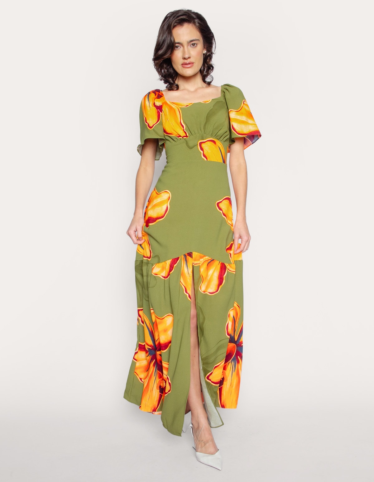 Vestido longo estampado com bojo e manga godê. perfeito para um look elegante e moderno.