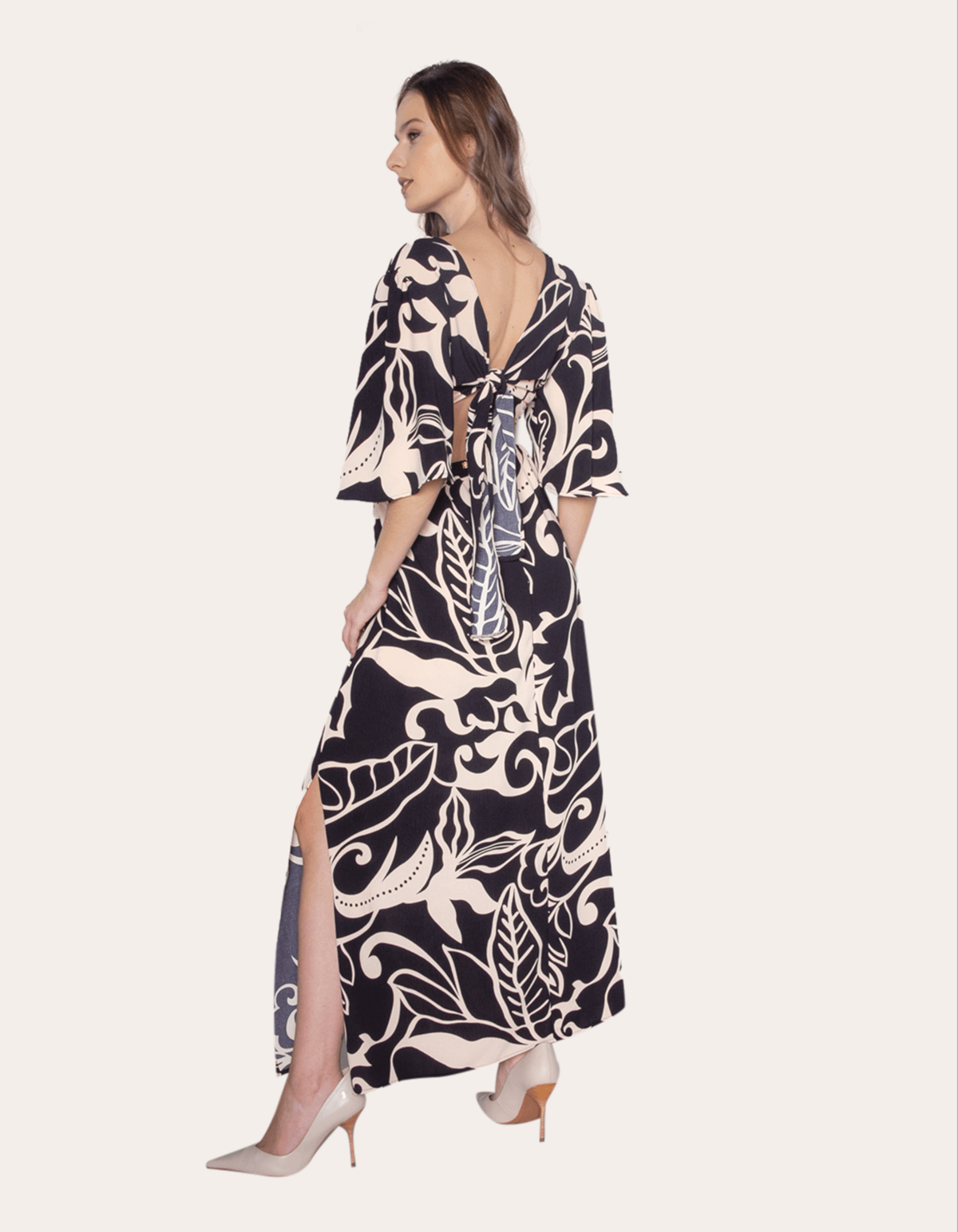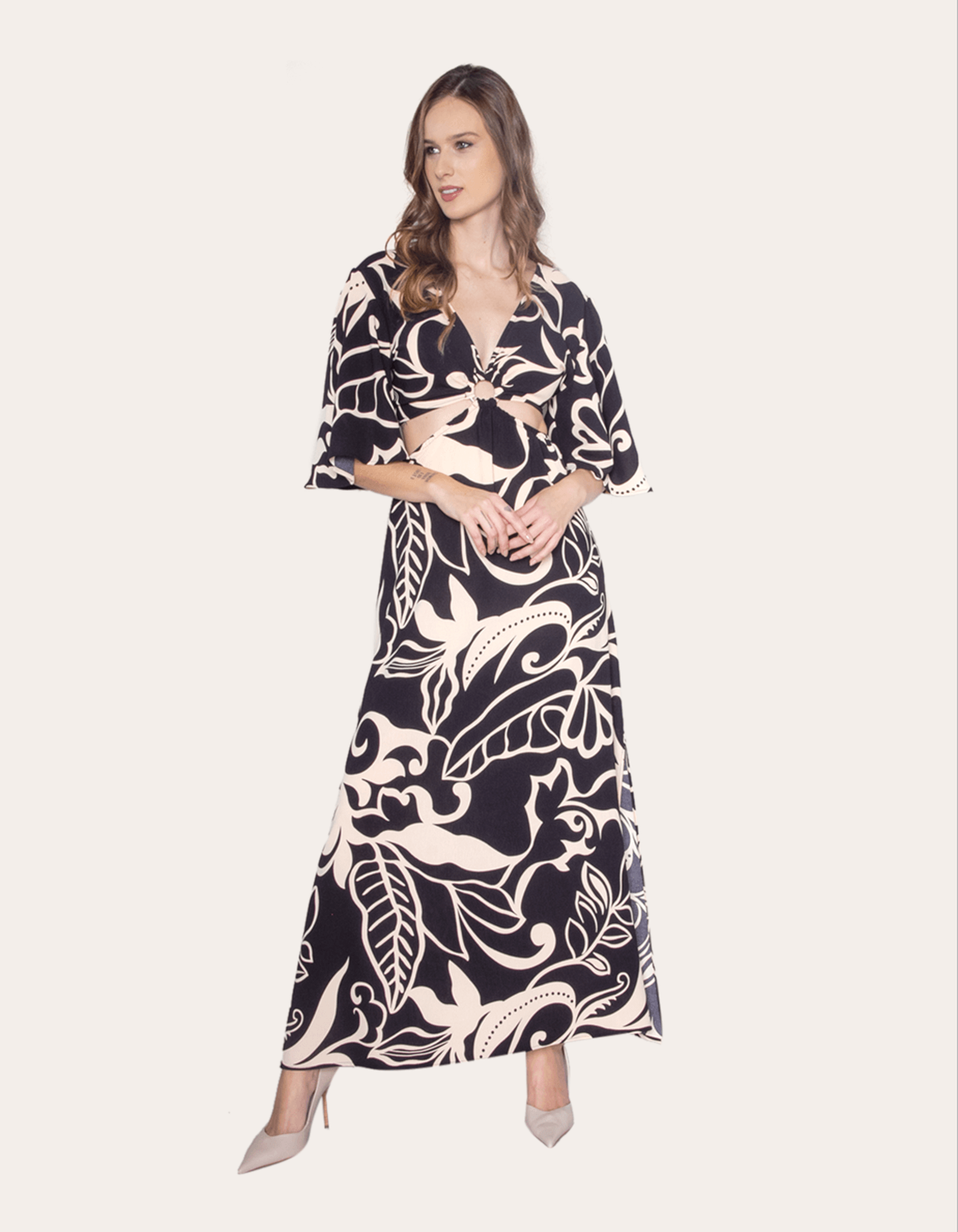 Vestido longo estampado manga godê, com bojo e detalhe argola no decote. possui amarração nas costas e cintura costas com elástico. uma peça elegante e atemporal.