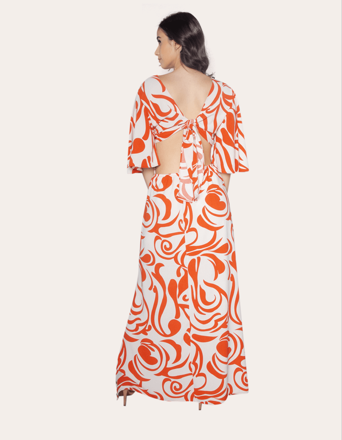 Vestido longo estampado manga godê, com bojo e detalhe argola no decote. possui amarração nas costas e cintura costas com elástico. uma peça elegante e atemporal.