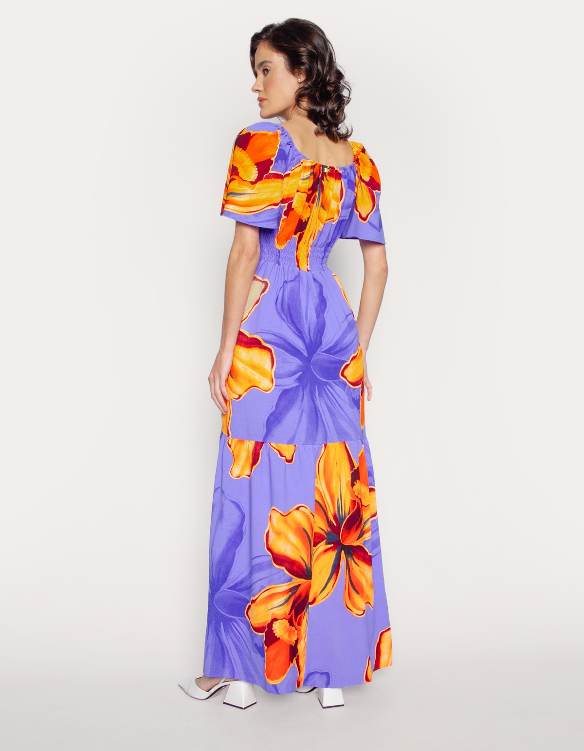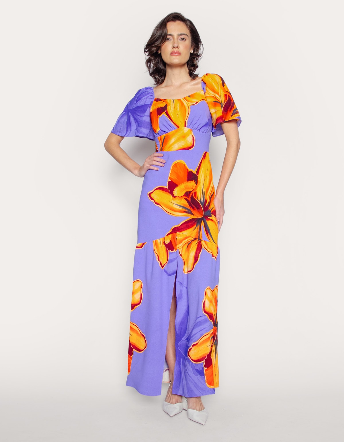 Vestido longo estampado com bojo e manga godê. perfeito para um look elegante e moderno.