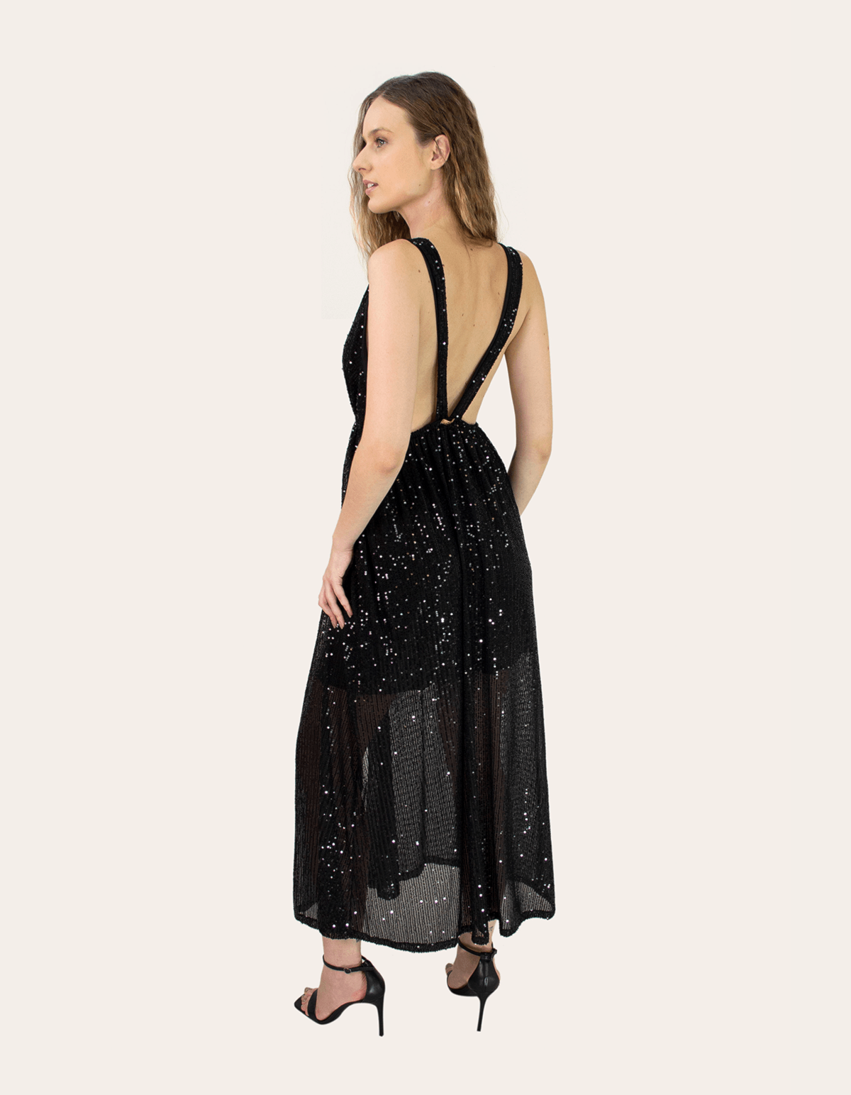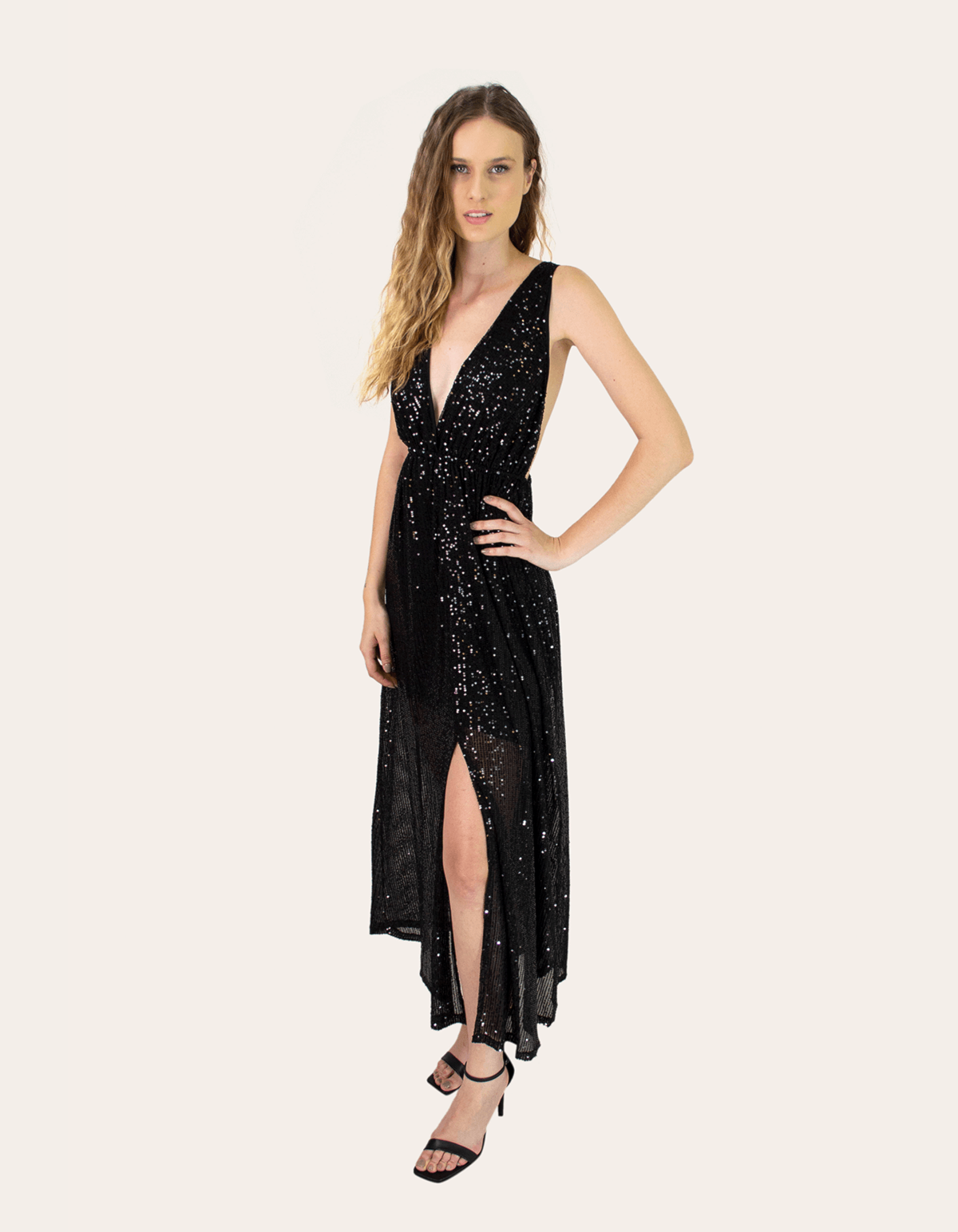 Vestido longo em paete, decote v e fenda na frente. chegou a hora de brilhar!!!