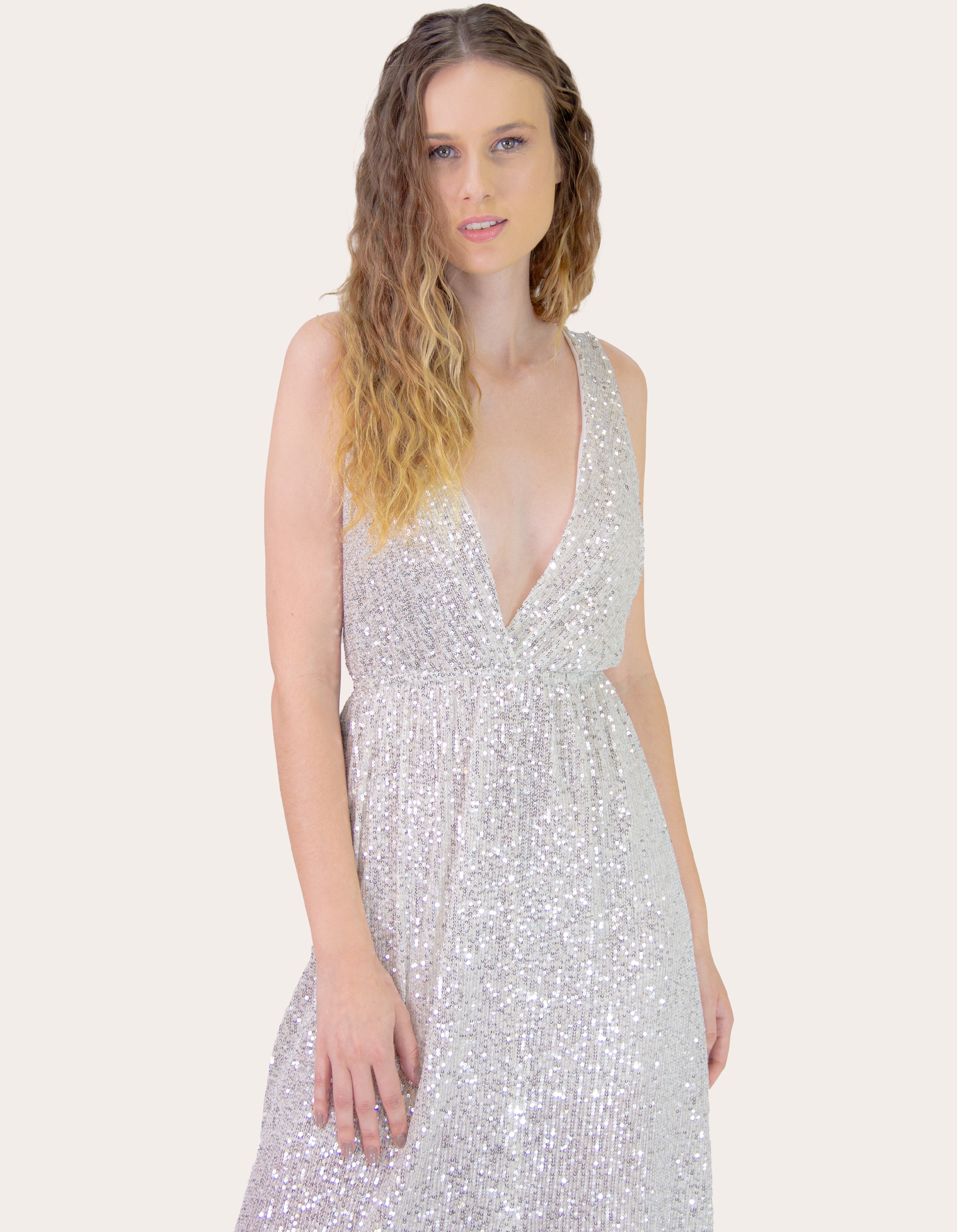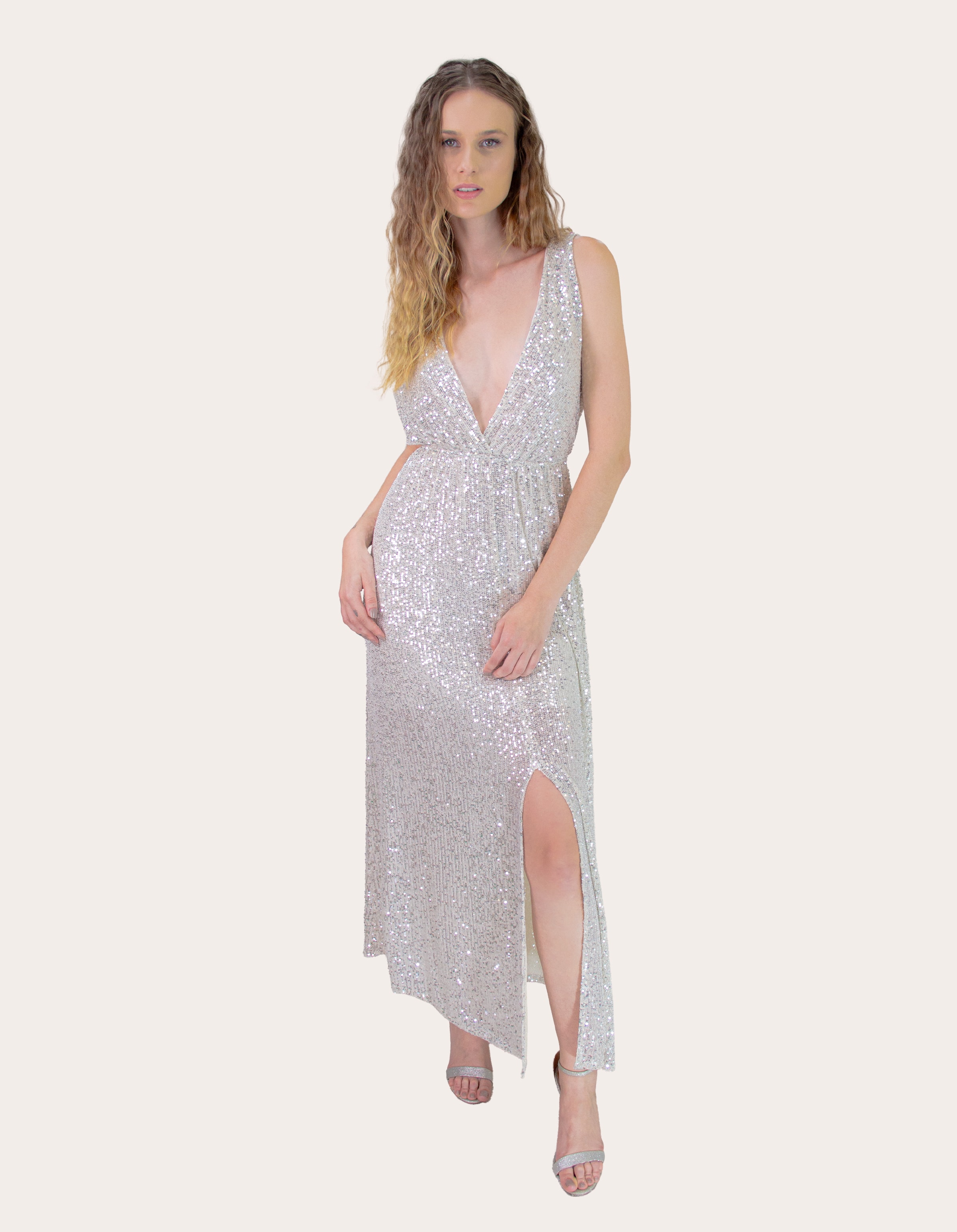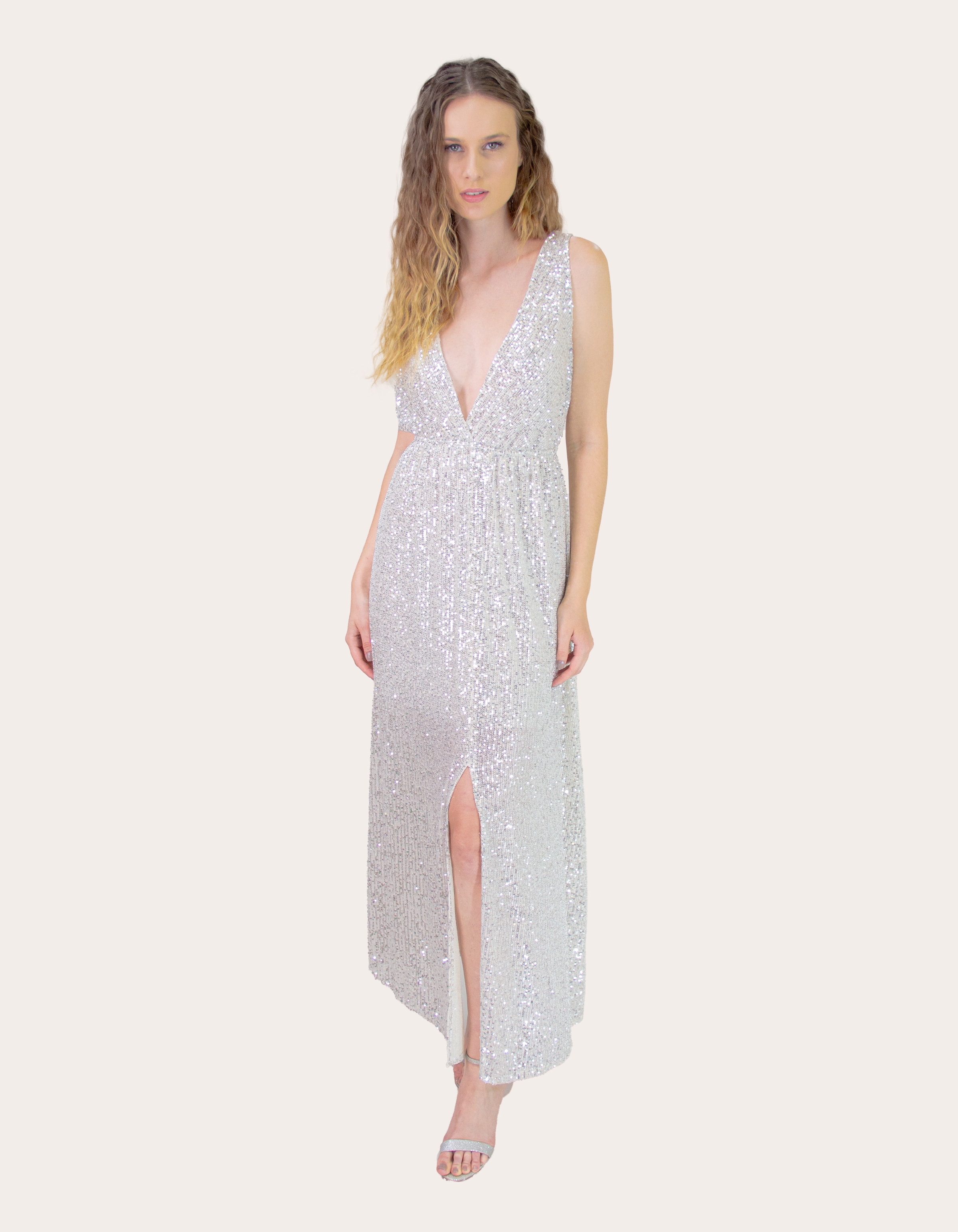 Vestido longo em paete, decote v e fenda na frente. chegou a hora de brilhar!!!
