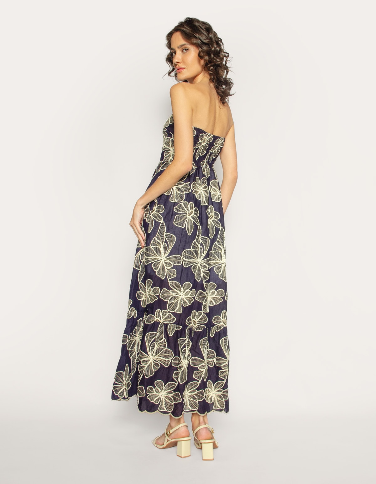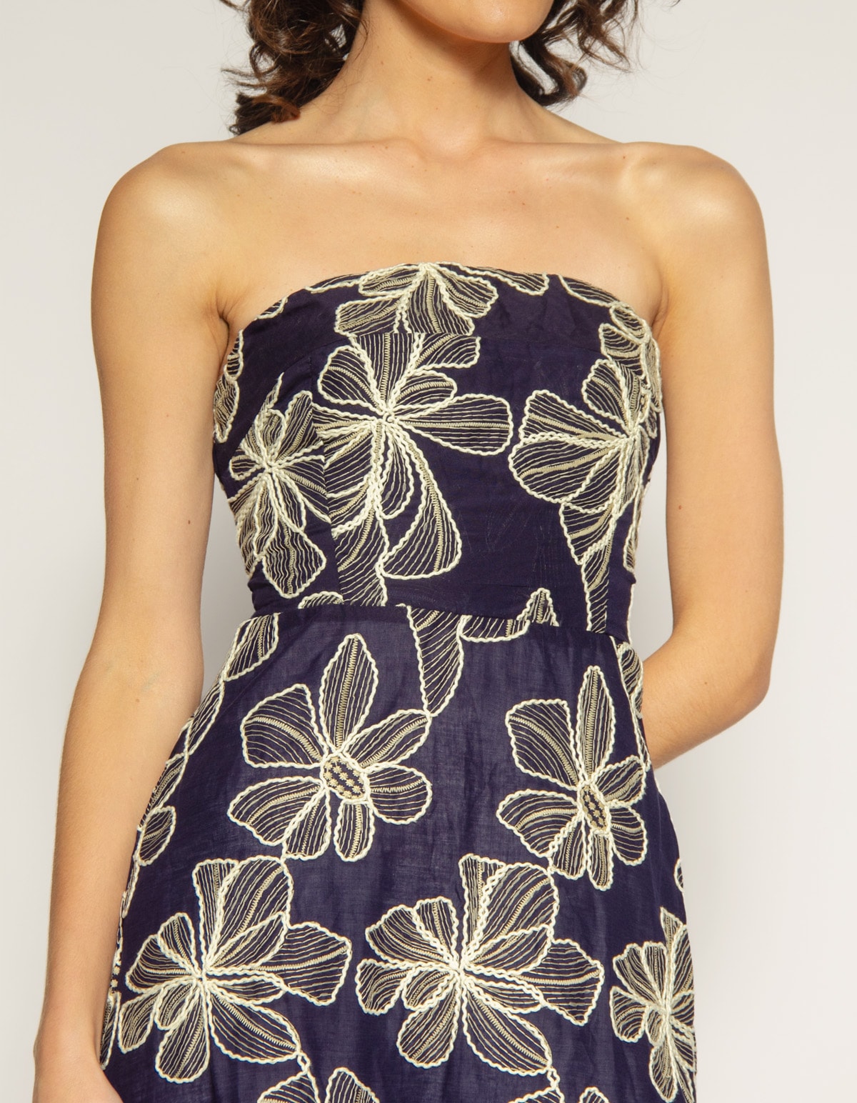 Vestido longo em laise bordado contrastante, tomara que caia, saia em corte evasê de volume moderado. De estilo vintage , remetendo a uma estética clássica e primaveril.