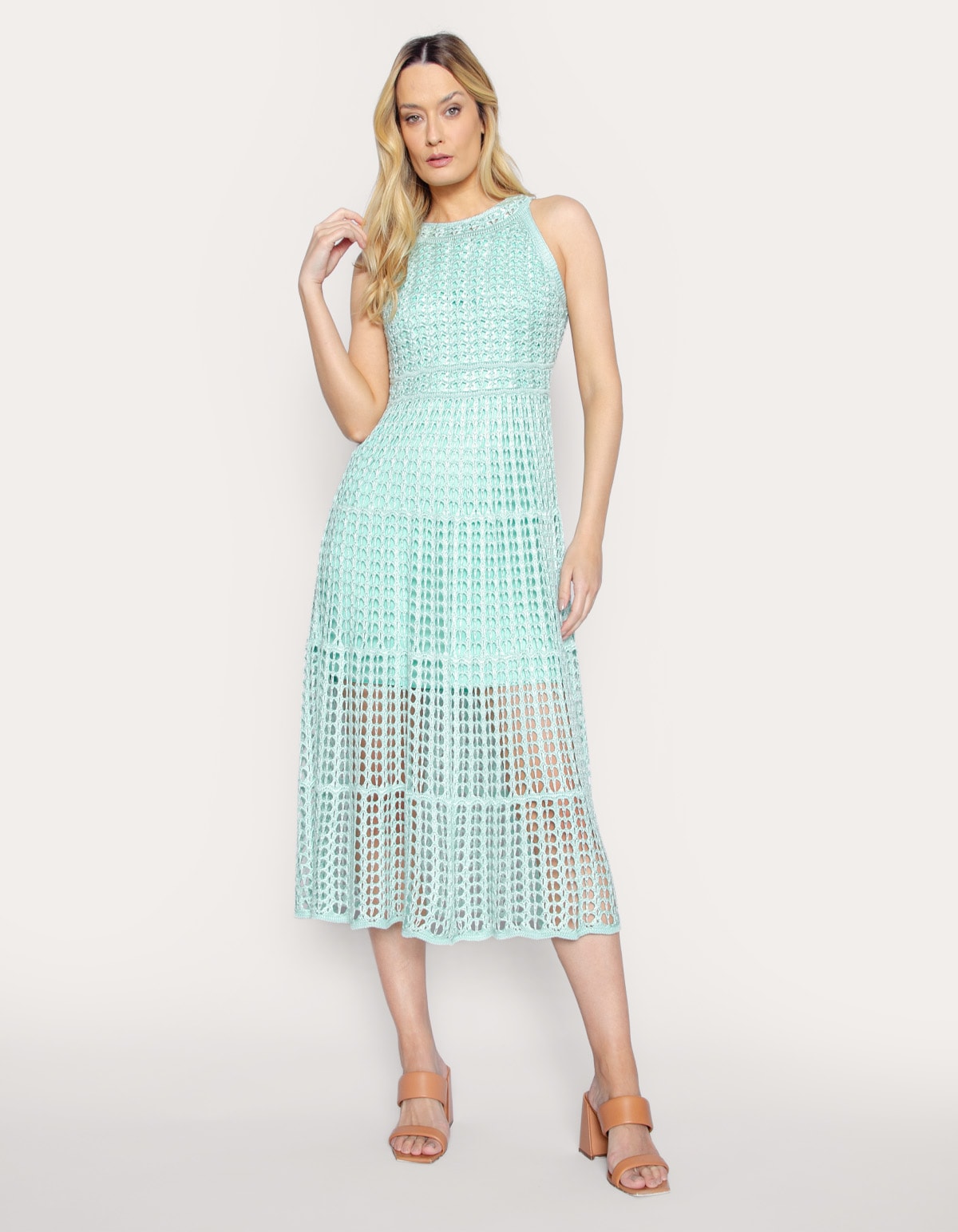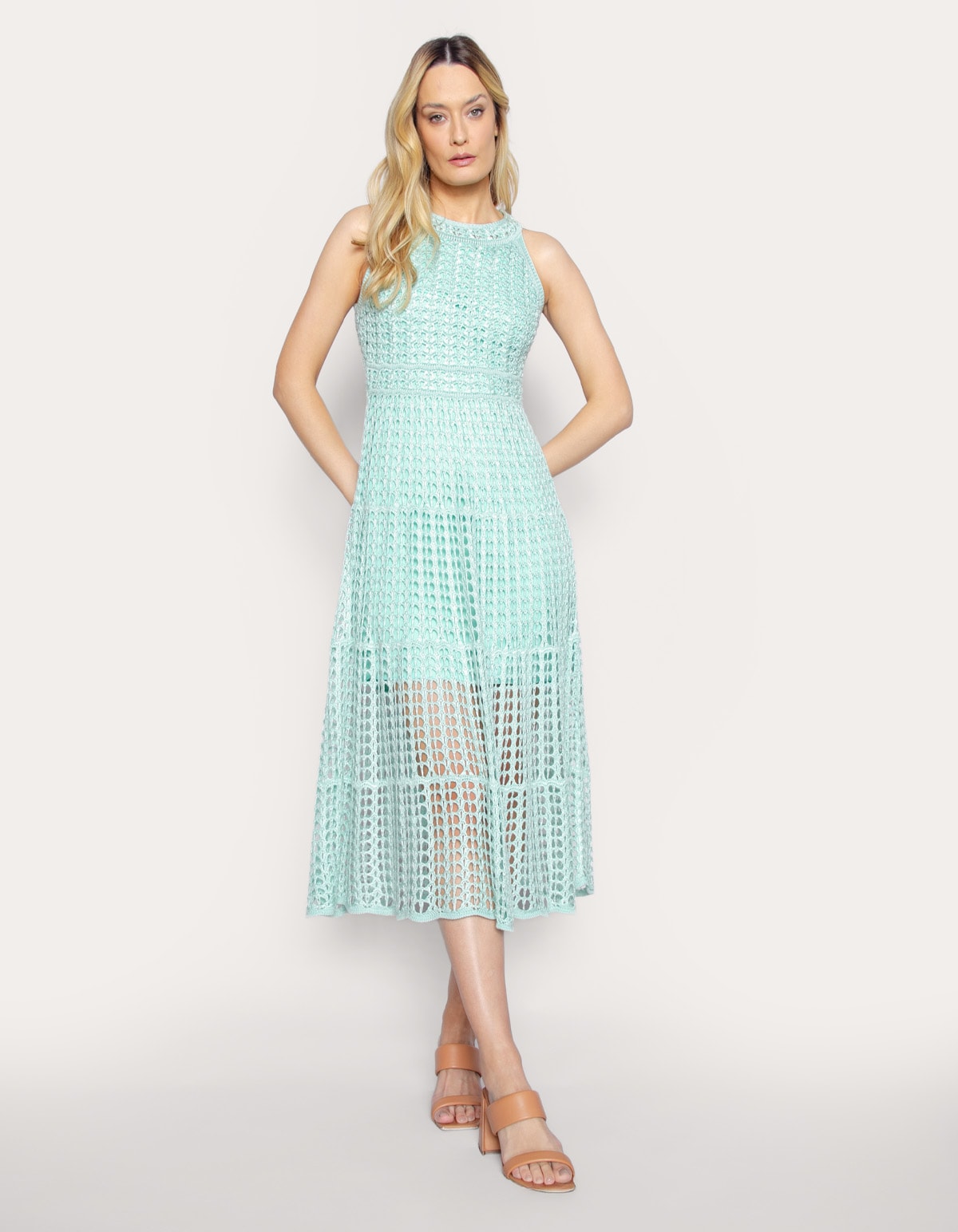 Vestido longo tricot, decote tipo halter ou gola alta discreta que se ajusta ao pescoço. Possui ponto denso e estruturado adicionando acabamento e sustentação, a cintura é marcada por uma faixa horizontal mais estreita e fechada que ajuda a definir a silhueta. A saia é confeccionada com ponto aberto e vazado, criando um efeito de grade ou tela, este padrão confere leveza e flidez à peça. Modelagem ajustada ao busto e cintura ese abre em uma saia evasê a partir do quadril, proporcionando um caimento elegante e feminino. Ideal para eventos como coquetéis de verão ou festas casuais elegantes.