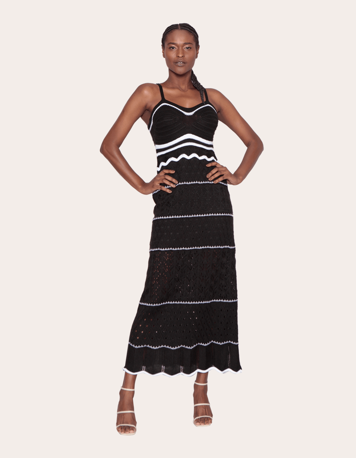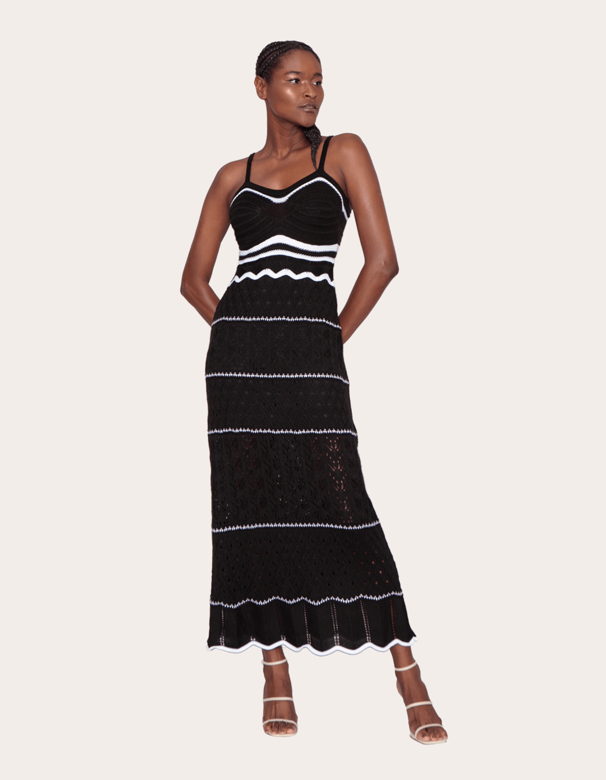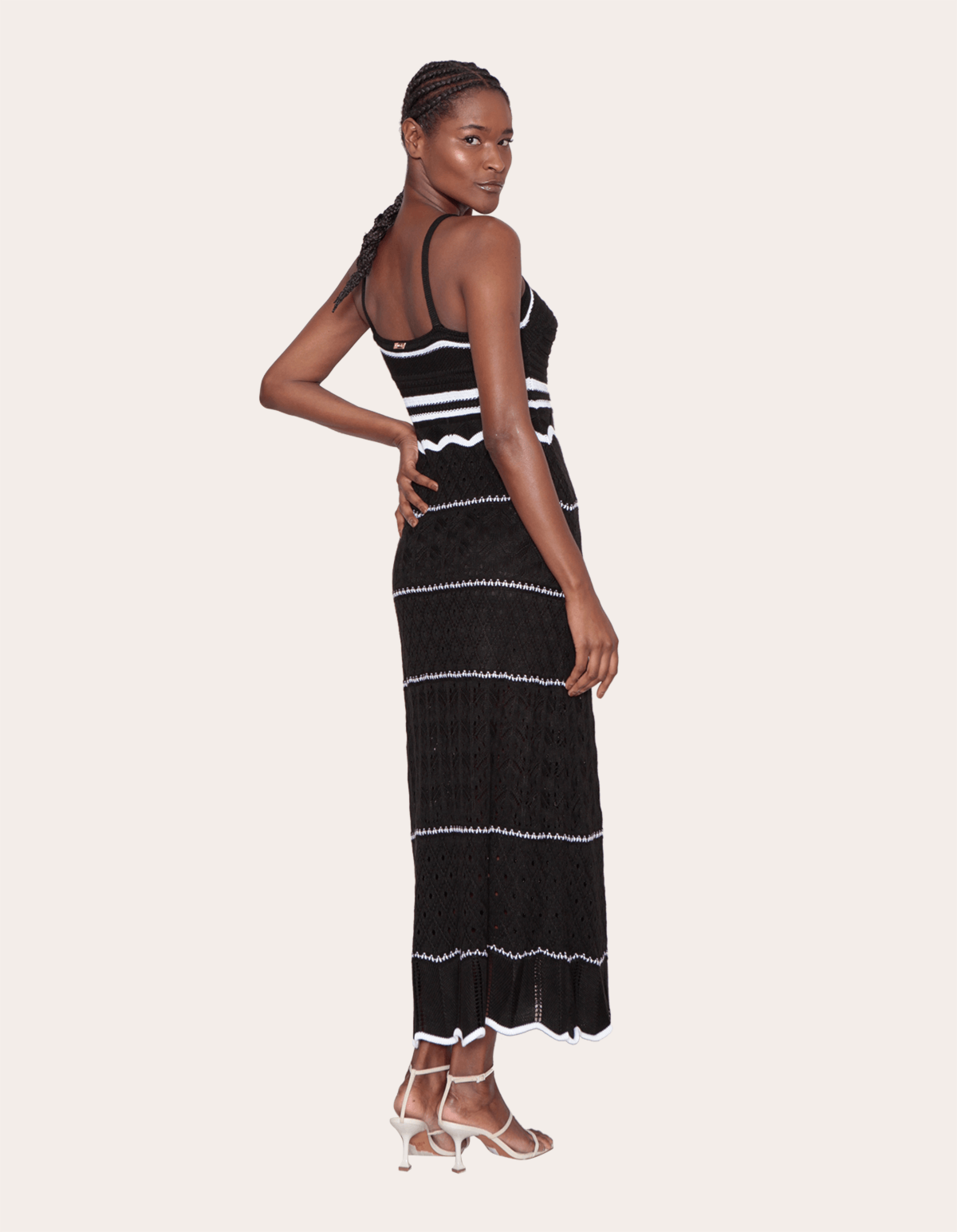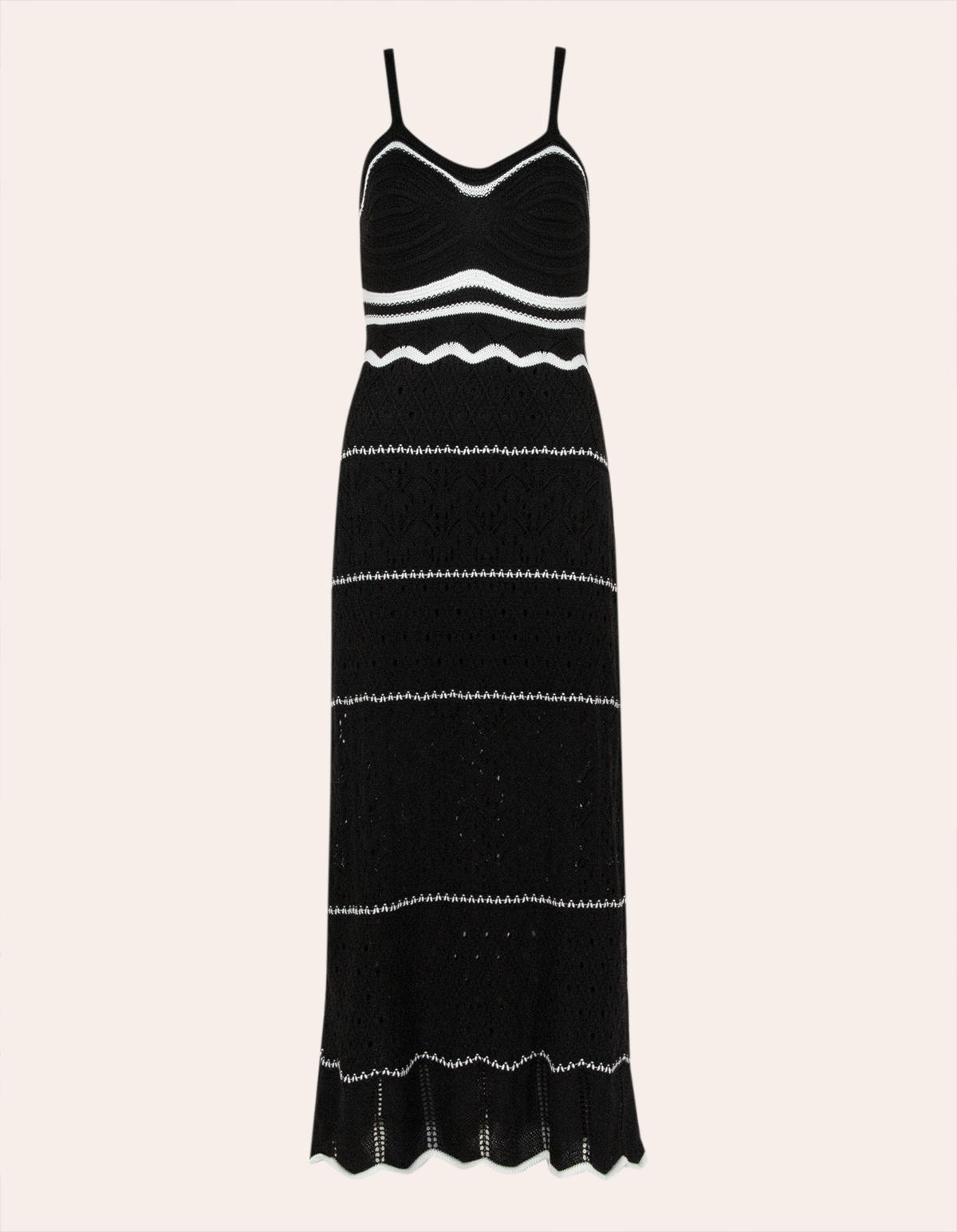 Vestido longo tricot de modelagem acinturada, alcinha, decote princesa, listras diferenciadas e "furinhos" que trazem leveza para a peça. ideal para usar em passeios noturnos em praias ou lugares mais quentes. invista!