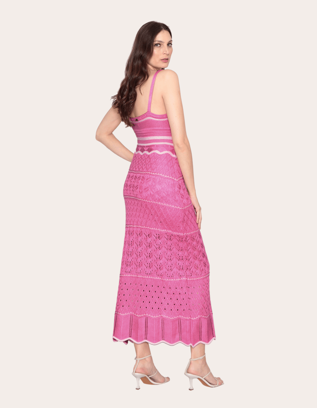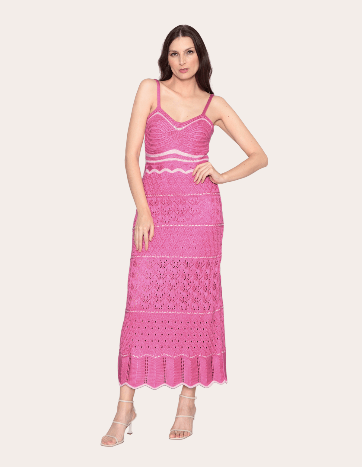Vestido longo tricot de modelagem acinturada, alcinha, decote princesa, listras diferenciadas e "furinhos" que trazem leveza para a peça. ideal para usar em passeios noturnos em praias ou lugares mais quentes. invista!