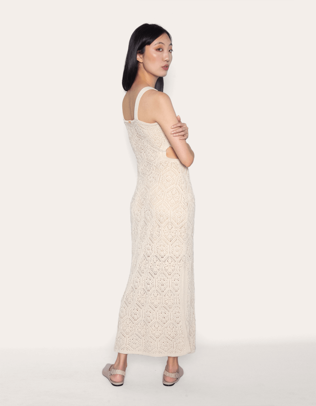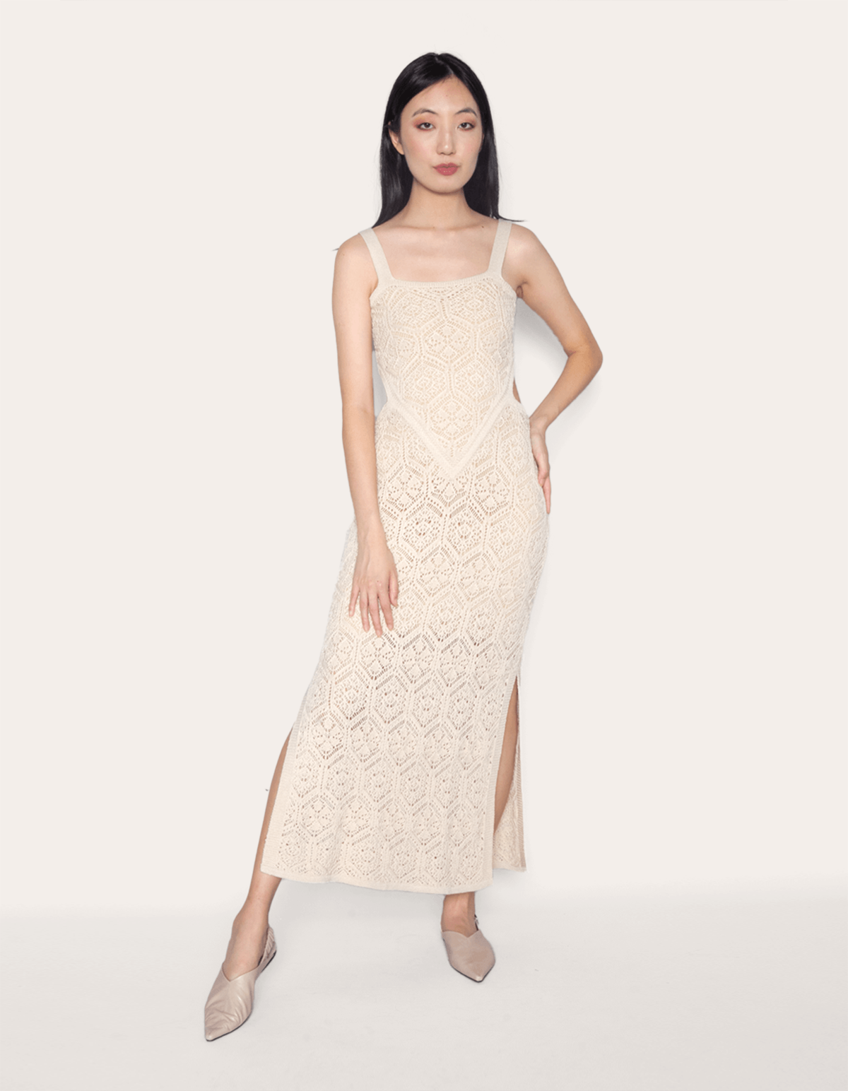 O detalhe rendado adiciona um toque de sofisticação e feminilidade ao vestido longo com alcinha de tricot, enquanto a abertura lateral confere um aspecto moderno e sedutor ao visual. perfeito para ocasiões especiais.
