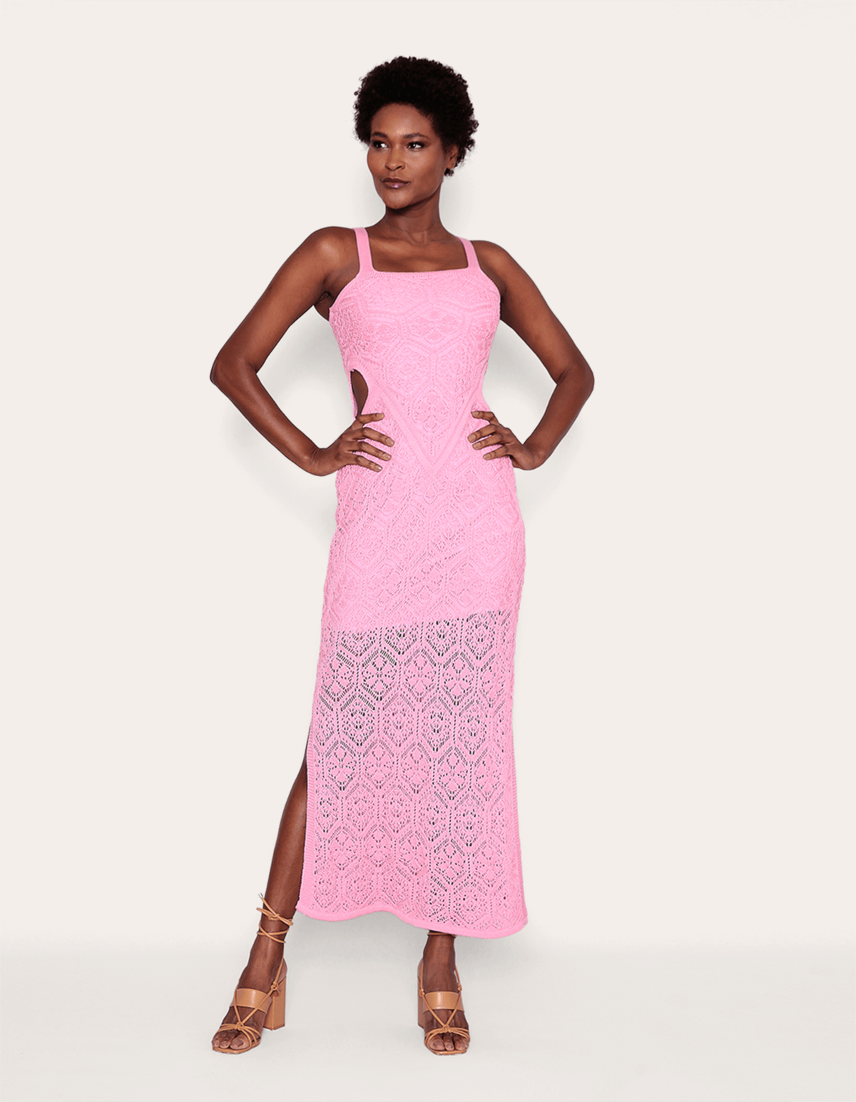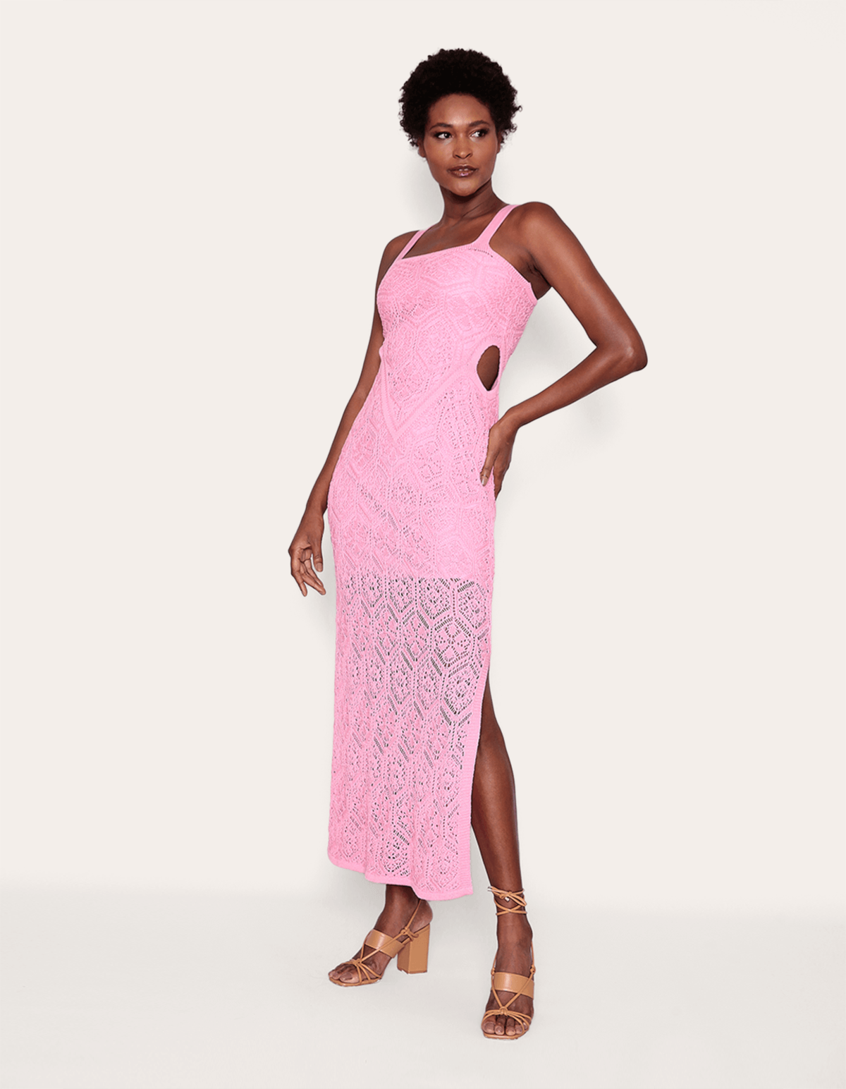 O detalhe rendado adiciona um toque de sofisticação e feminilidade ao vestido longo com alcinha de tricot, enquanto a abertura lateral confere um aspecto moderno e sedutor ao visual. perfeito para ocasiões especiais.