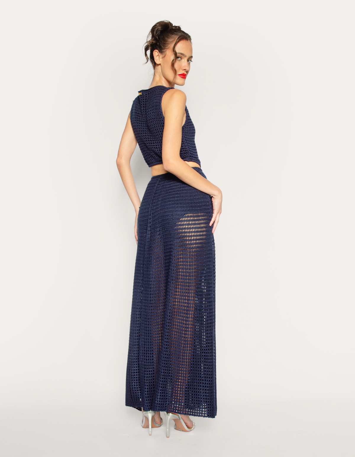 Vestido longo em tricot com recortes na cintura, possui trama aberta e geométrica, que confere leveza e transparência. Ajustado ao corpo e solto a saia. Decote redondo sem mangas. Possui um forro (hotpants) devido à natureza vazada, ideal para o verão, praia,piscina, eventos chiques em clima quente, como festas em piscinas ou praias.