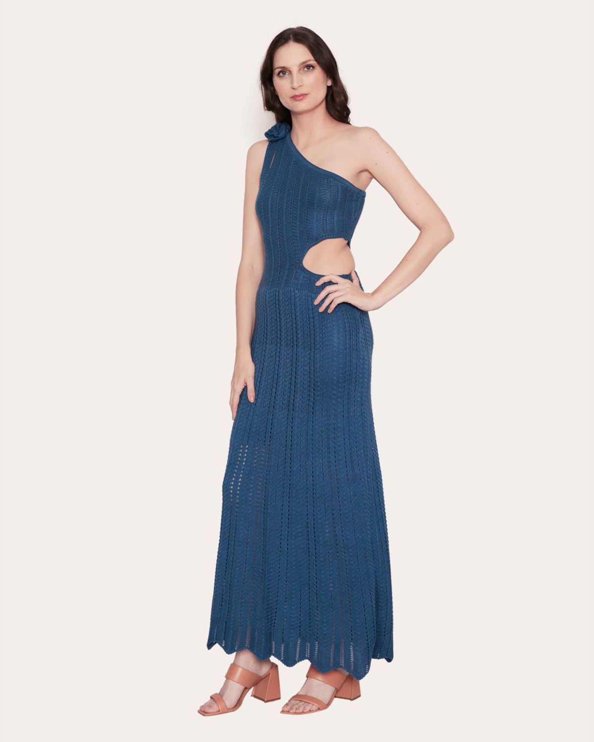 Vestido longo tricot ombro só com recorte e flor, possui recorte também na lateral da cintura. celebre a beleza do verão em um vestido deslumbrante!