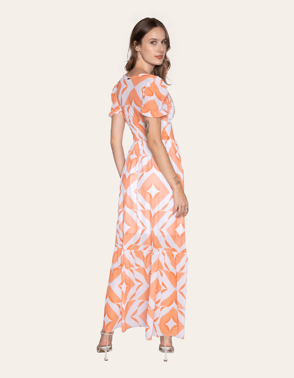 Vestido confeccionado em tule estampado. a peça possui decote v com bojo, mangas curtas com elástico, forro fixo, caimento reto, comprimento longo e acabamento simples. leve, a peça além de agregar estilo ao seu visual, proporciona muito conforto e liberdade durante os movimentos. cheio de estilo, o modelo é um look completo e perfeito para quem gosta de se vestir com muita personalidade e destaque.