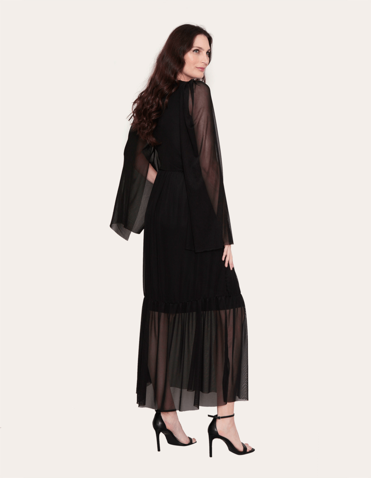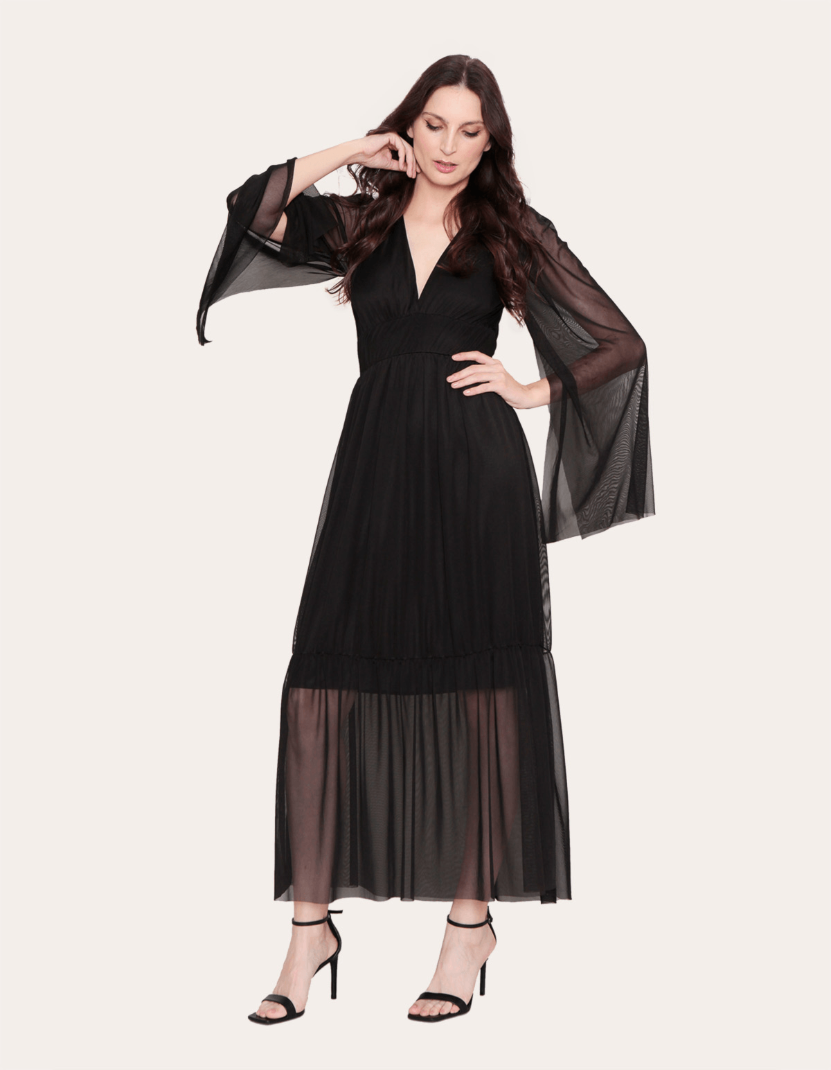 Vestido longo, manga longa ampla com abertura, decote v, possui bojo. modelo que traz sensualidade com um toque de delicadeza.