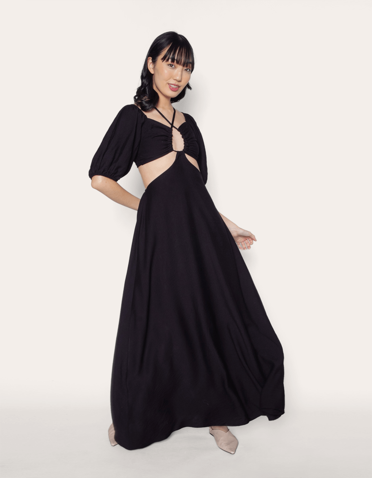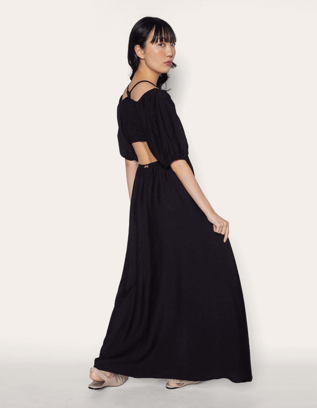 Vestido longo, decote v com amarração no busto, recorte vazado nas laterais, mangas 3/4 com elástico para usar ou caidinha como ciganinha, ou então sobre o ombro. aquele modelo diferente que não pode faltar no seu guarda-roupa.
