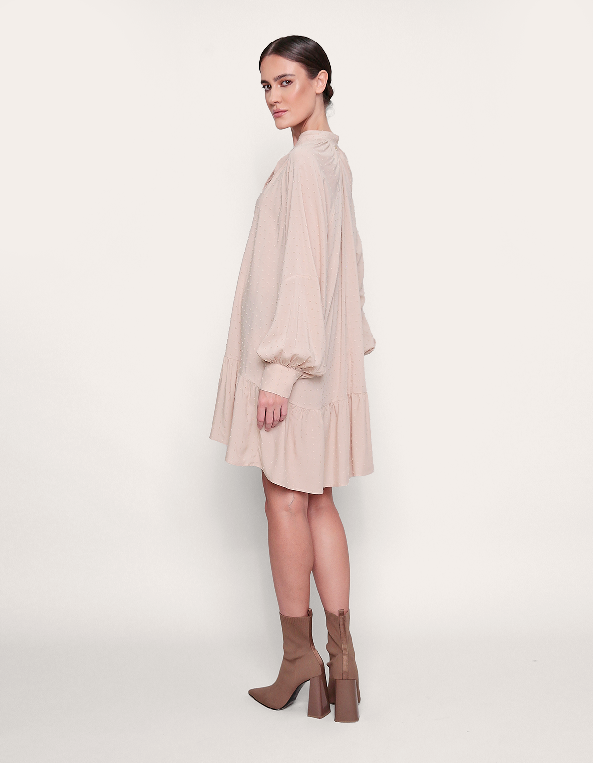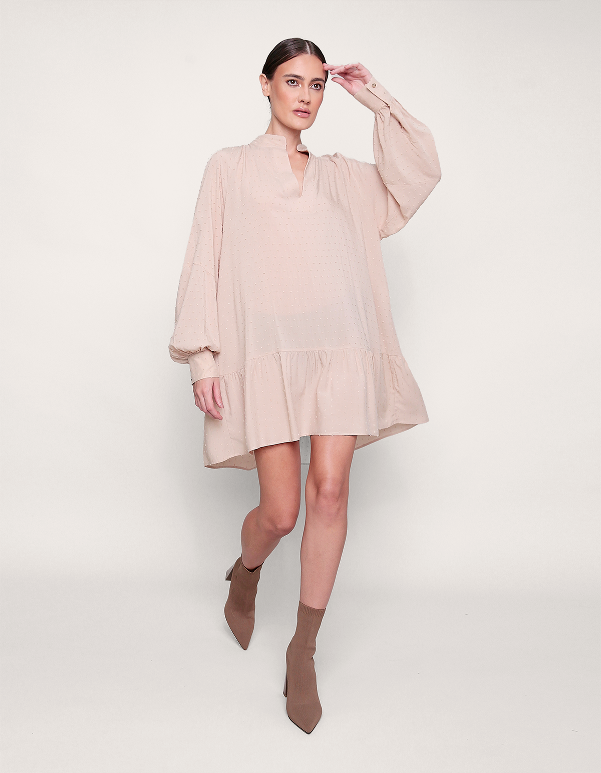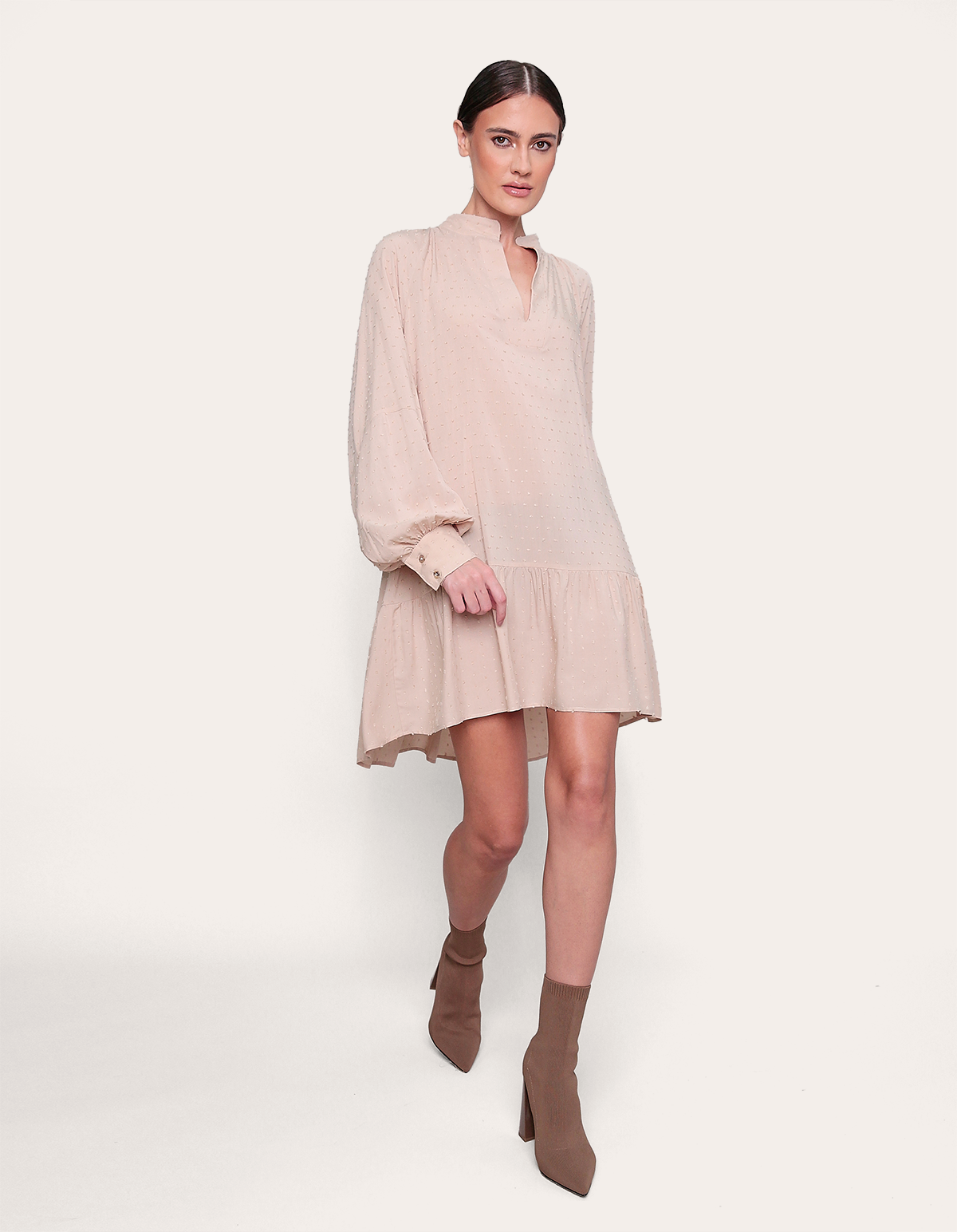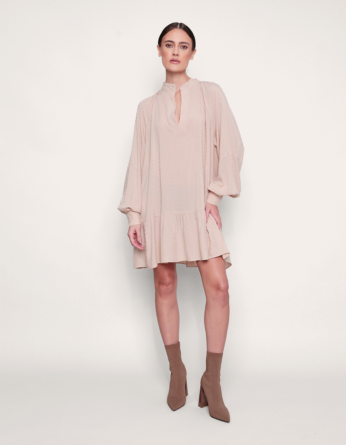 Vestido curtocom mangas longas e modelagem ampla. a peça conta com golinha média e abertura no decote. a saia é ampla e conta com um recorte. estilo boho, tendência da temporada