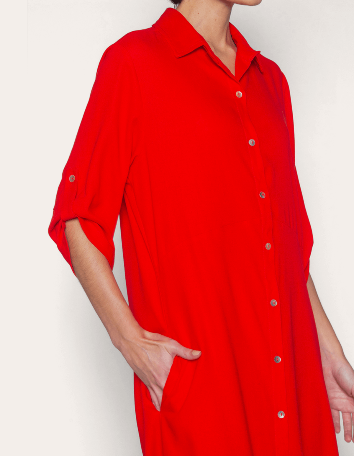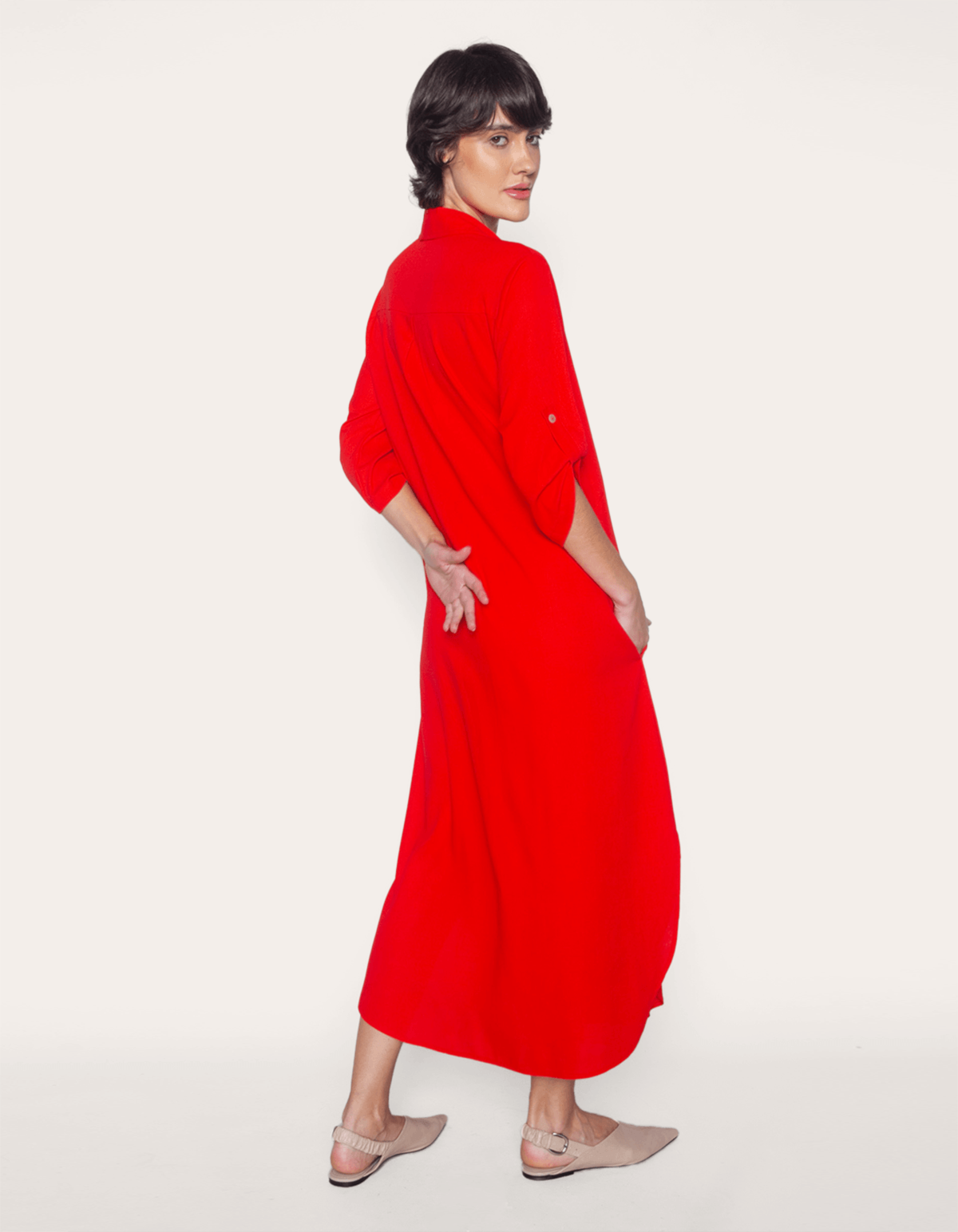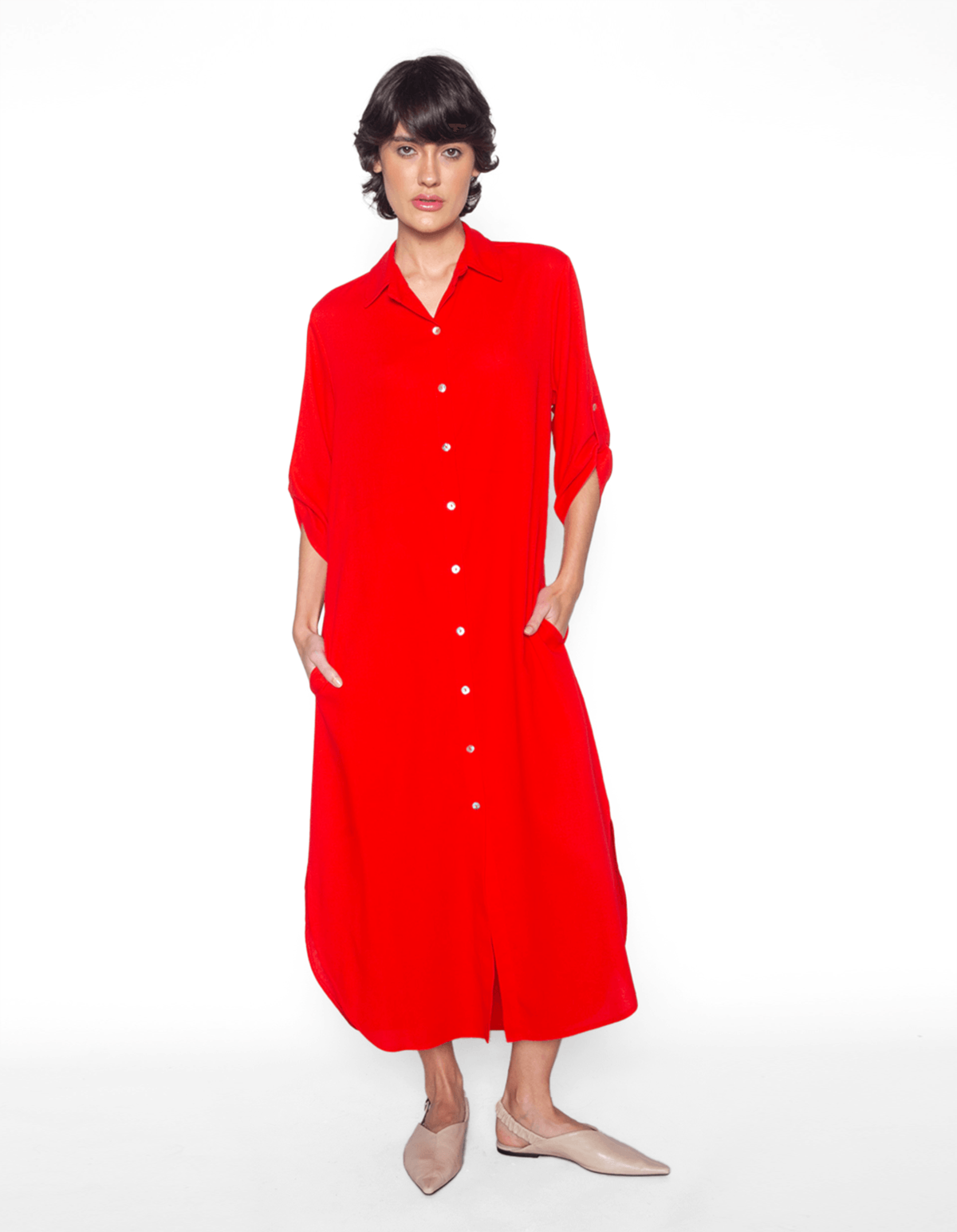 Vestido midi chemise, manga 3/4 e abotoamento frontal. É uma peça curinga em vários sentidos: além de destacar o corpo, pode ser usado desde um dia frio até os mais quentes. Sabendo combinar, é tiro e queda para ficar estilosa. O vestido chemise com shape camisa, tem ganhado cada vez mais espaço no guarda-roupa, seu caimento soltinho com mangas ajustadas traduz elegância e feminilidade às produções. Um cinto largo é o acessório ideal para marcar a cintura..