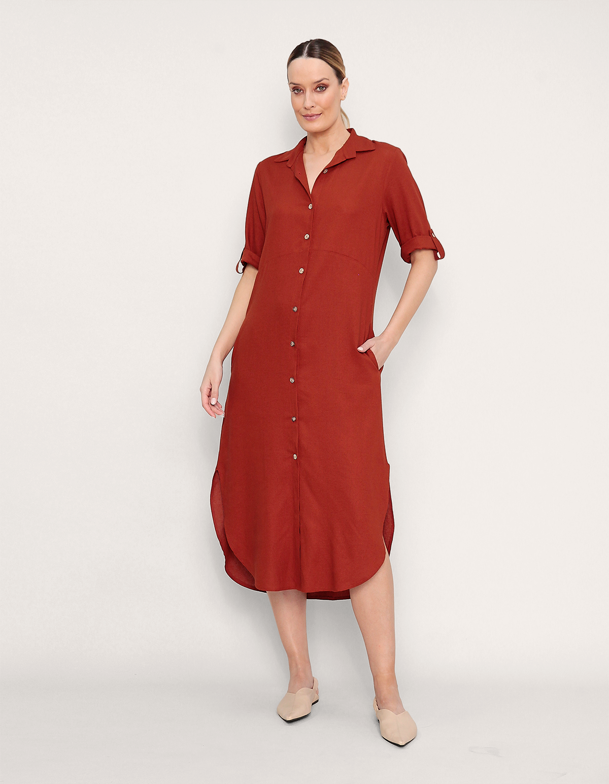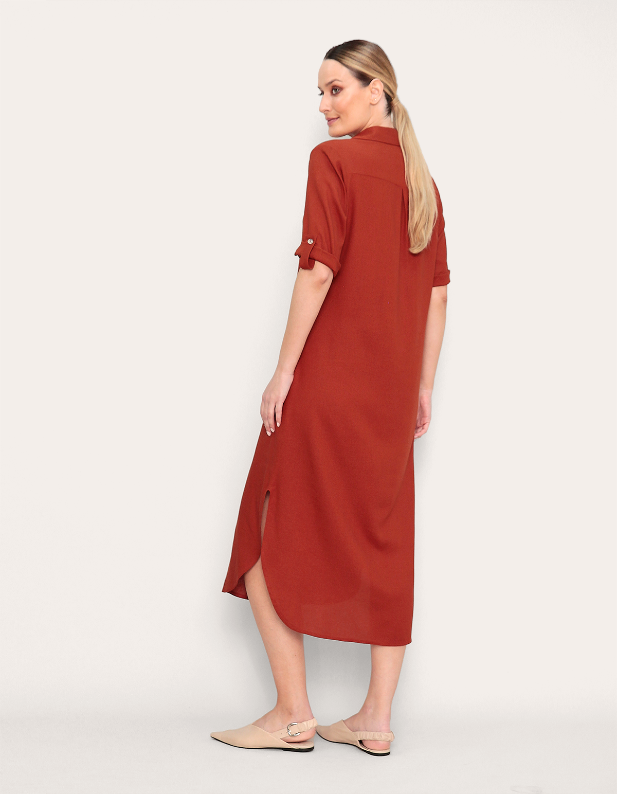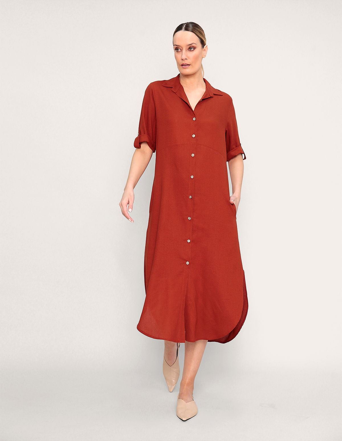 Vestido midi chemise, manga 3/4 e abotoamento frontal. É uma peça curinga em vários sentidos: além de destacar o corpo, pode ser usado desde um dia frio até os mais quentes. Sabendo combinar, é tiro e queda para ficar estilosa. O vestido chemise com shape camisa, tem ganhado cada vez mais espaço no guarda-roupa, seu caimento soltinho com mangas ajustadas traduz elegância e feminilidade às produções. Um cinto largo é o acessório ideal para marcar a cintura..