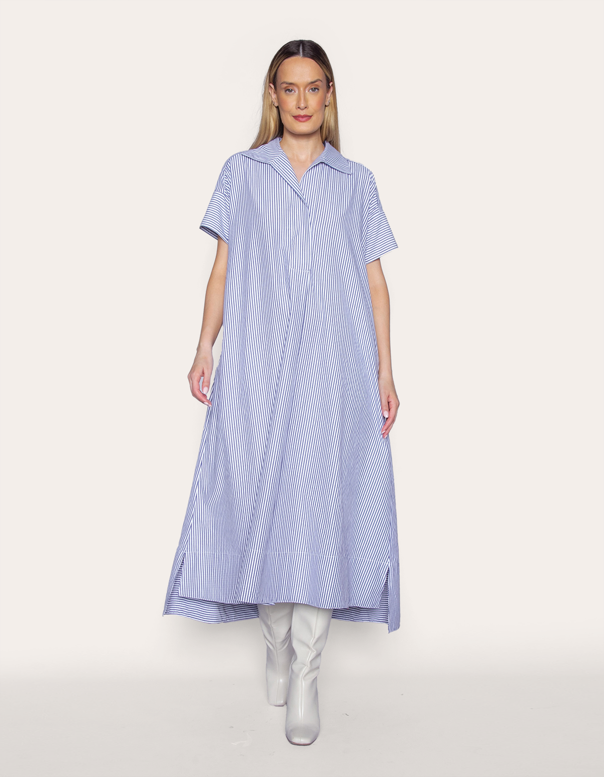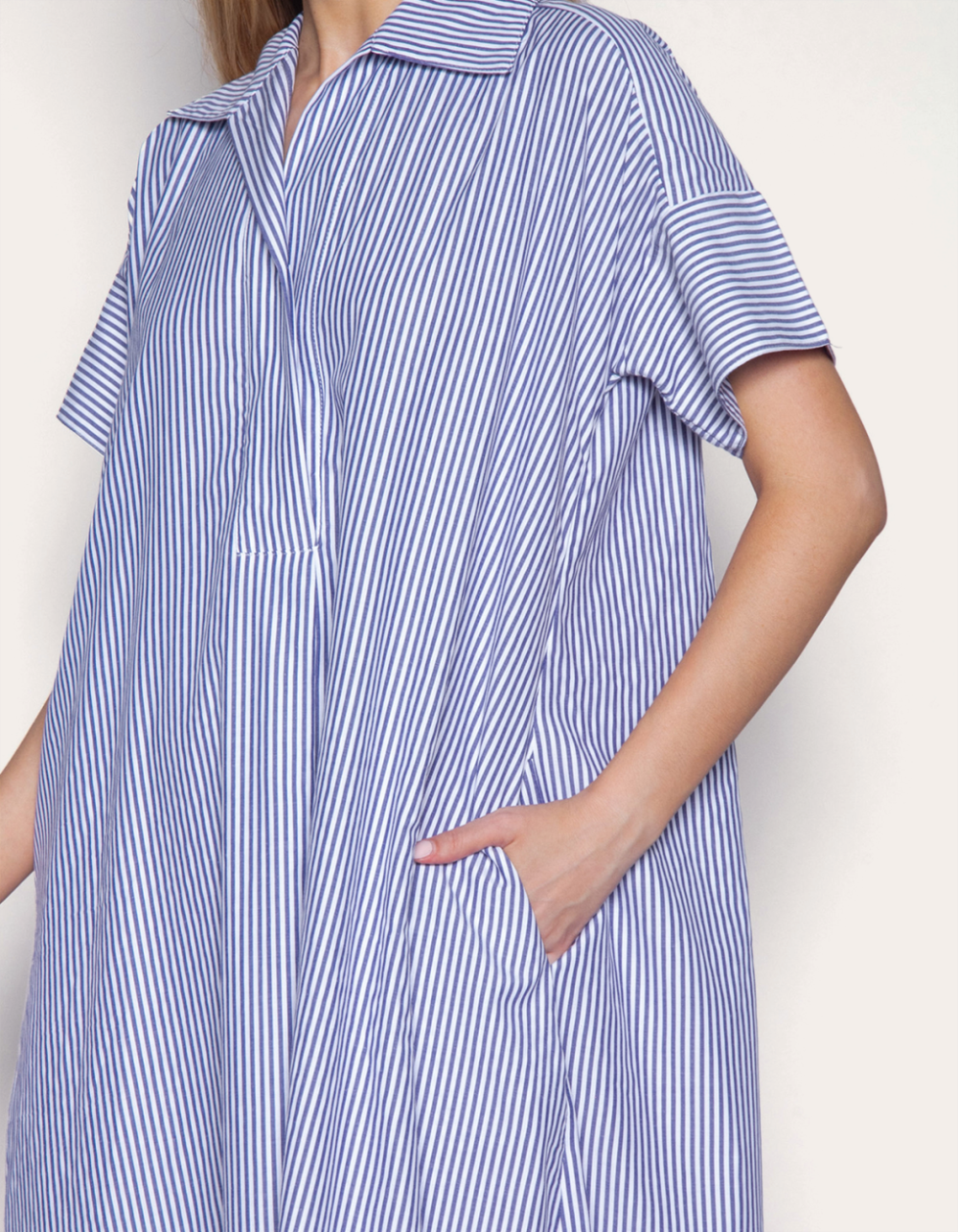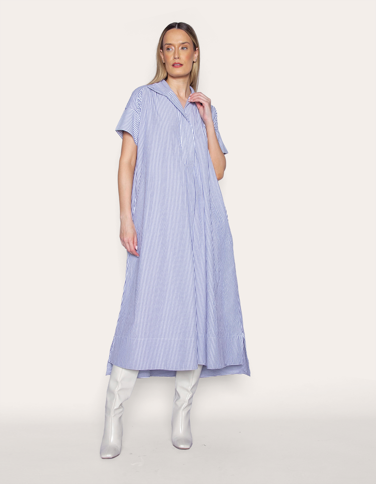 É uma peça que combina elegância e conforto. com listras verticais que alongam a silhueta, ele possui um design clássico com gola, vista e mangas curtas. o comprimento midi e o corte amplo proporcionam um caimento fluido e sofisticado, tornando-o uma escolha versátil para diversas ocasiões. ideal para quem busca um look refinado e prático, pode ser usado tanto em contextos formais quanto informais, dependendo dos acessórios e calçados escolhidos.