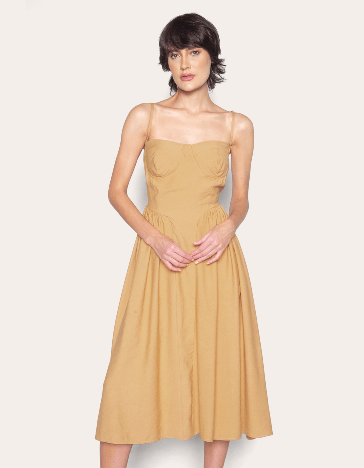 Vestido midi de alcinha fina com regulador, busto em corset que valoriza o colo, elástico e fechamento em zíper nas costas. uma peça versátil que te traz leveza e elegância onde você estiver.