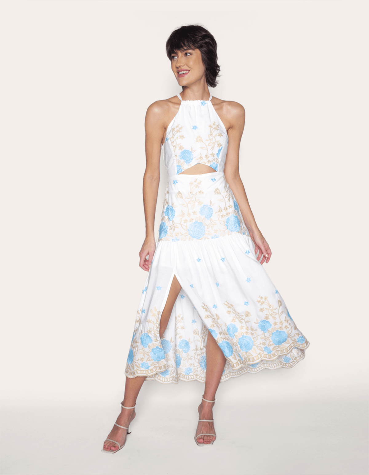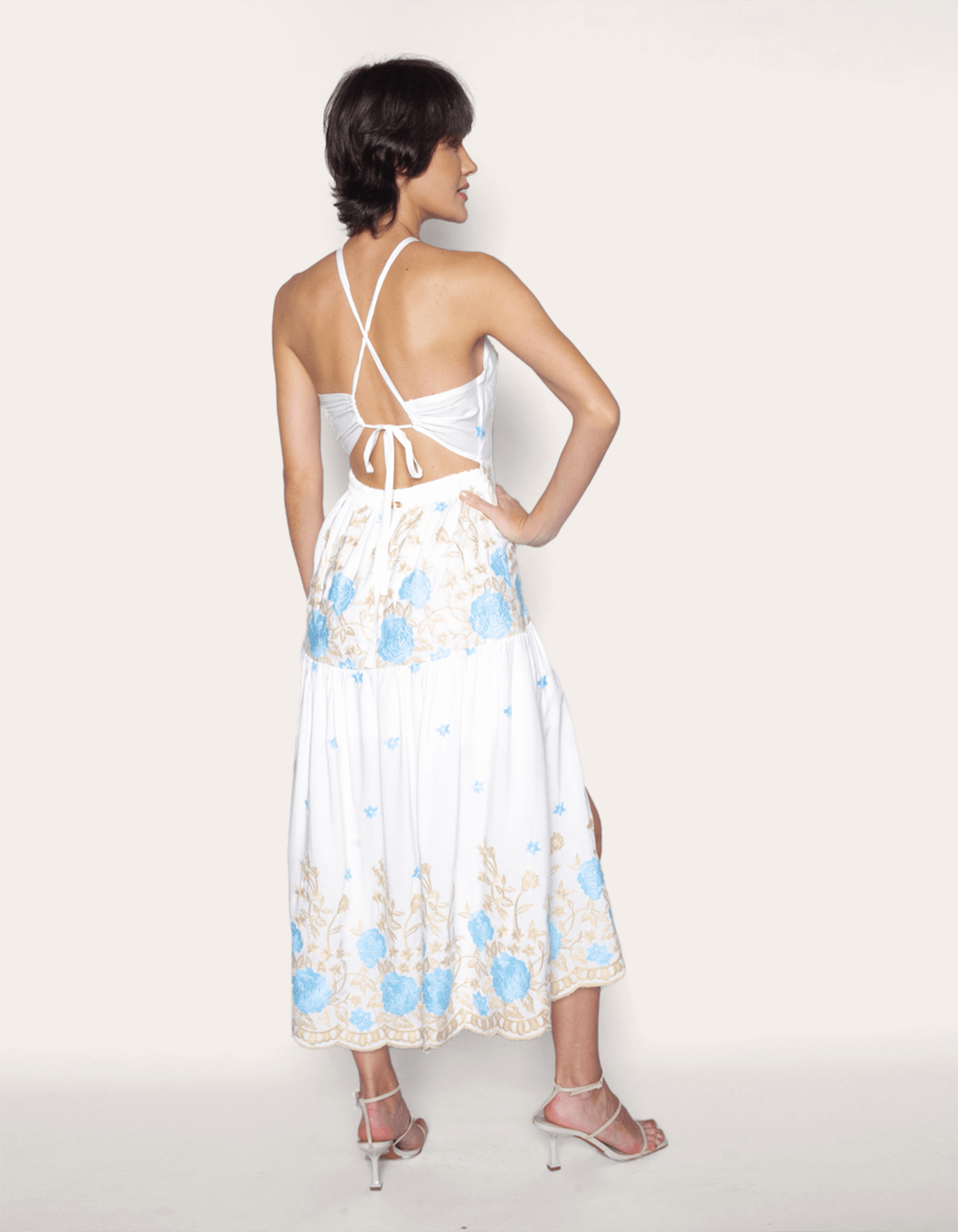 Vestido midi bordado, frente única, com bojo, amarra nas costas, possui elástico na cintura. detalhe de recorte frontal na cintura. com bordado moderno e cheio e delicadeza, este vestido é ideal para ocasiões especiais onde se deseja destacar-se com um visual refinado e moderno, perfeito para mulheres que valorizam a estética romântica em suas produções.