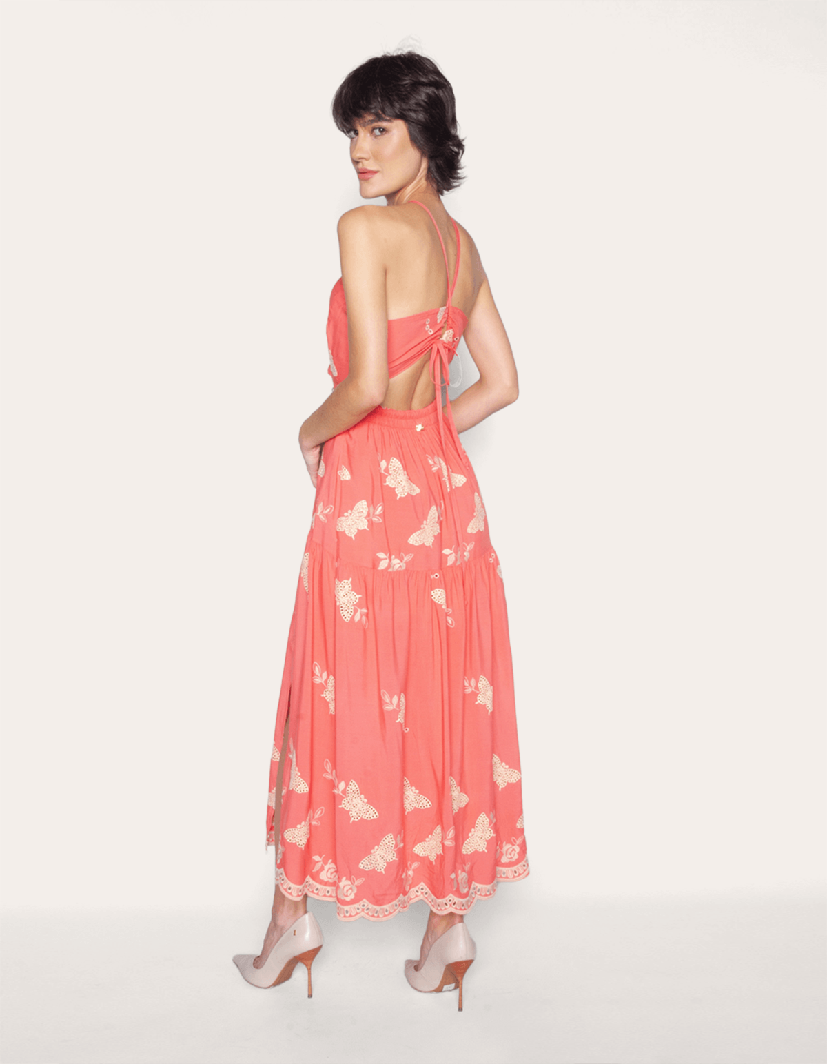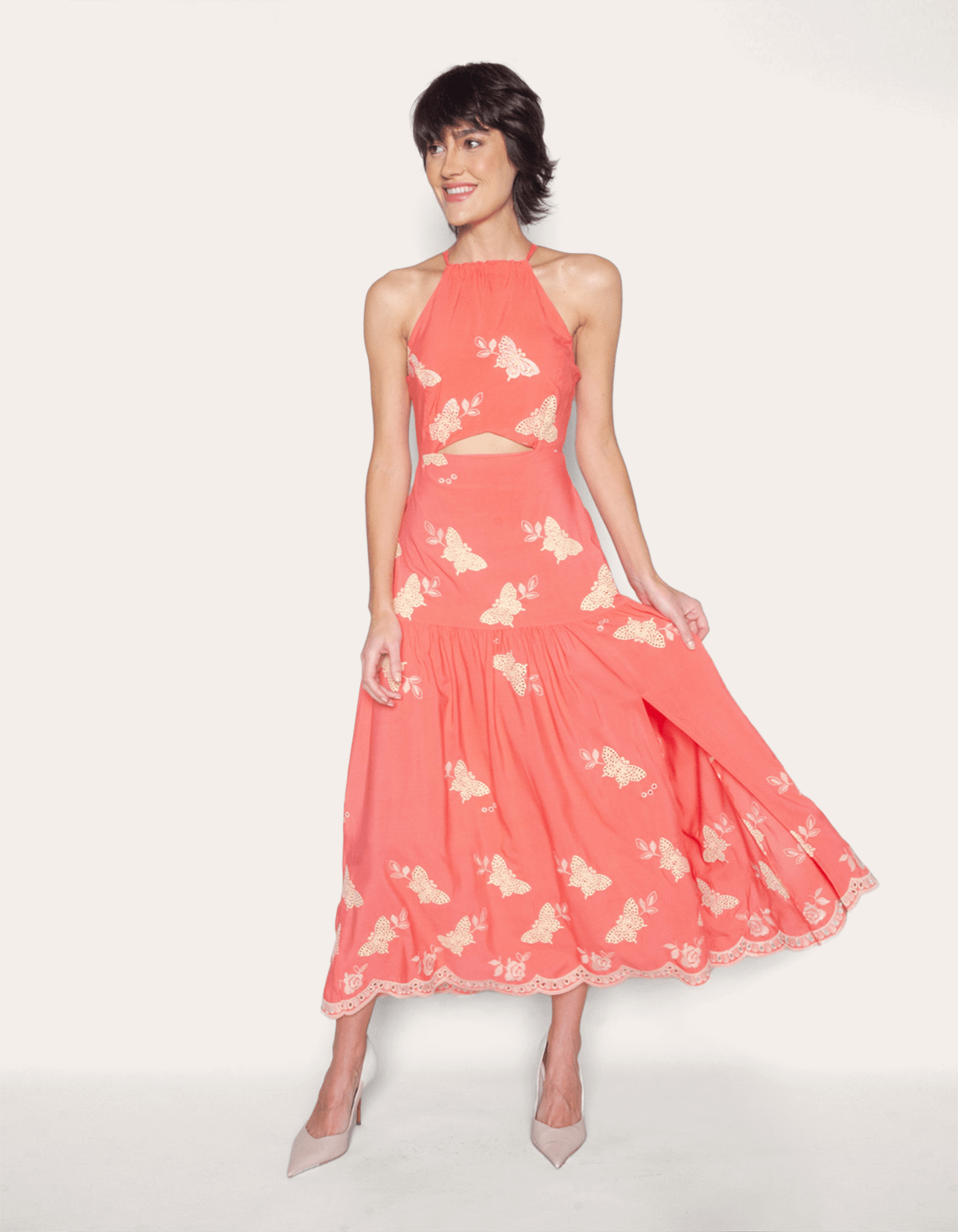 Vestido midi bordado, frente única, com bojo, amarra nas costas, possui elástico na cintura. detalhe de recorte frontal na cintura. com bordado moderno e cheio e delicadeza, este vestido é ideal para ocasiões especiais onde se deseja destacar-se com um visual refinado e moderno, perfeito para mulheres que valorizam a estética romântica em suas produções.