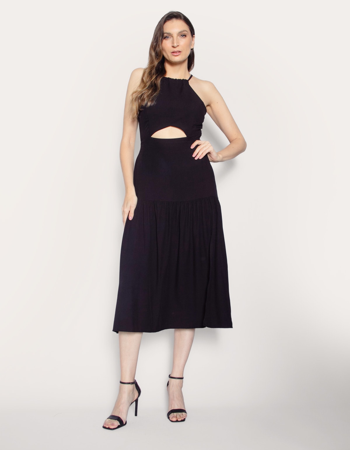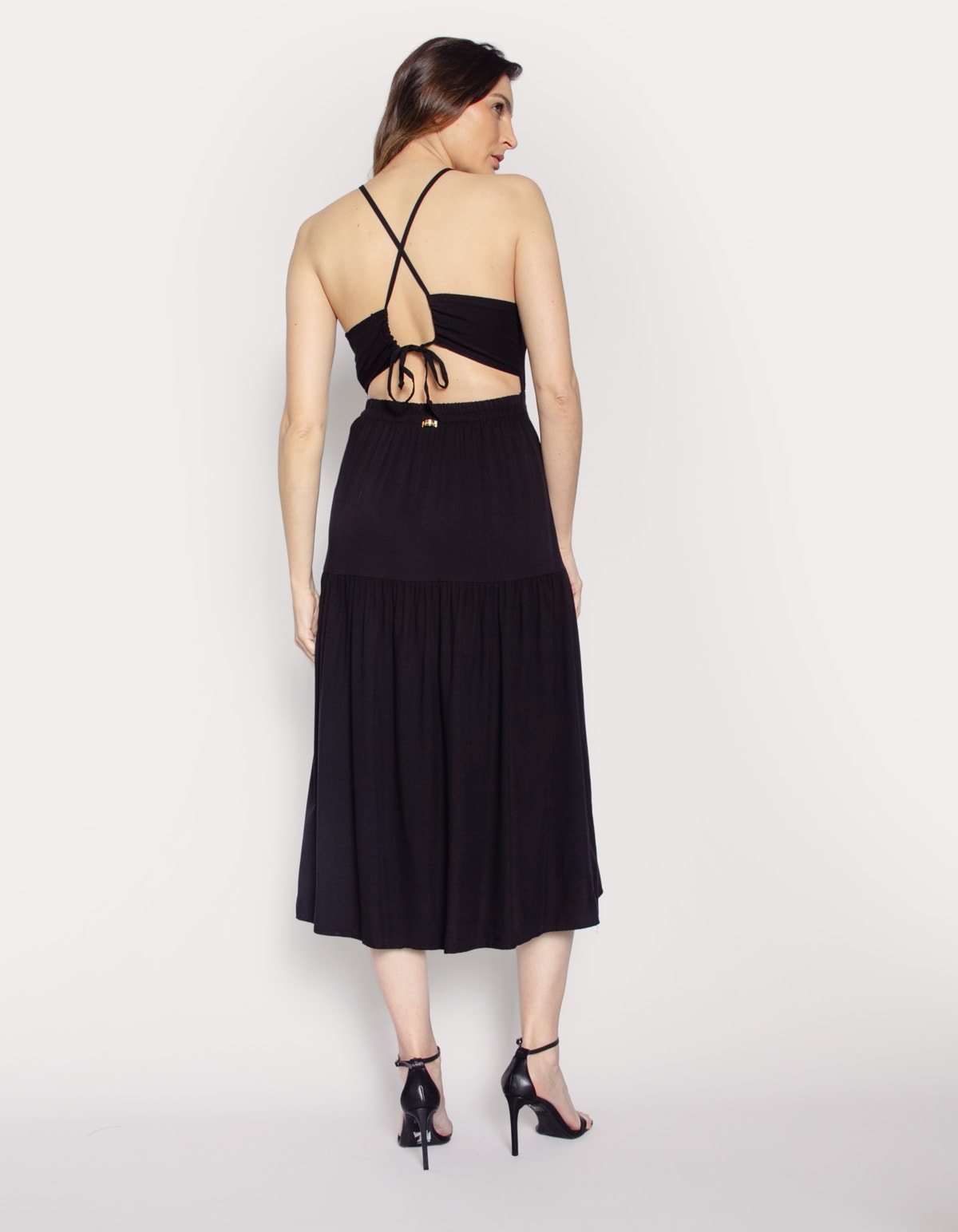 Vestido midi, frente única com bojo, amarra nas costas, possui elástico na cintura. Detalhe de recorte frontal na cintura. Este vestido é ideal para ocasiões especiais onde se deseja destacar-se com um visual refinado e moderno, perfeito para mulheres que valorizam a estética romântica em suas produções.