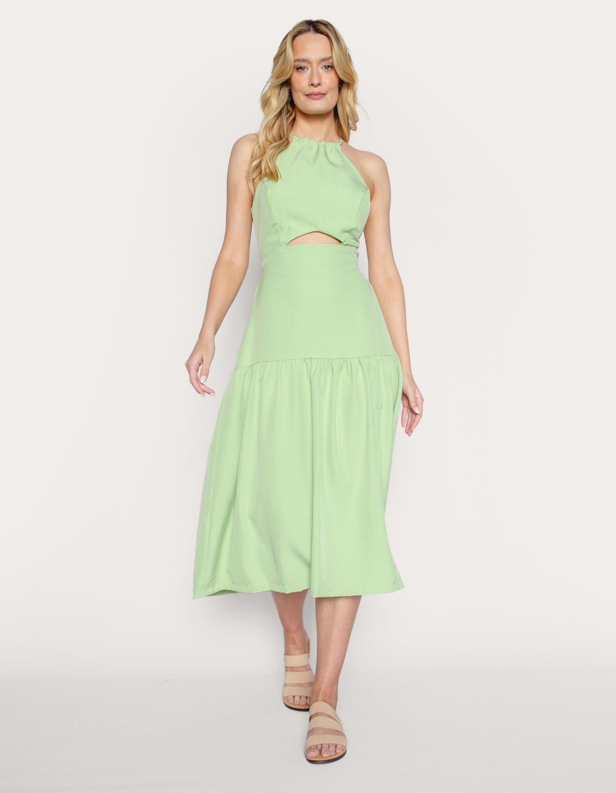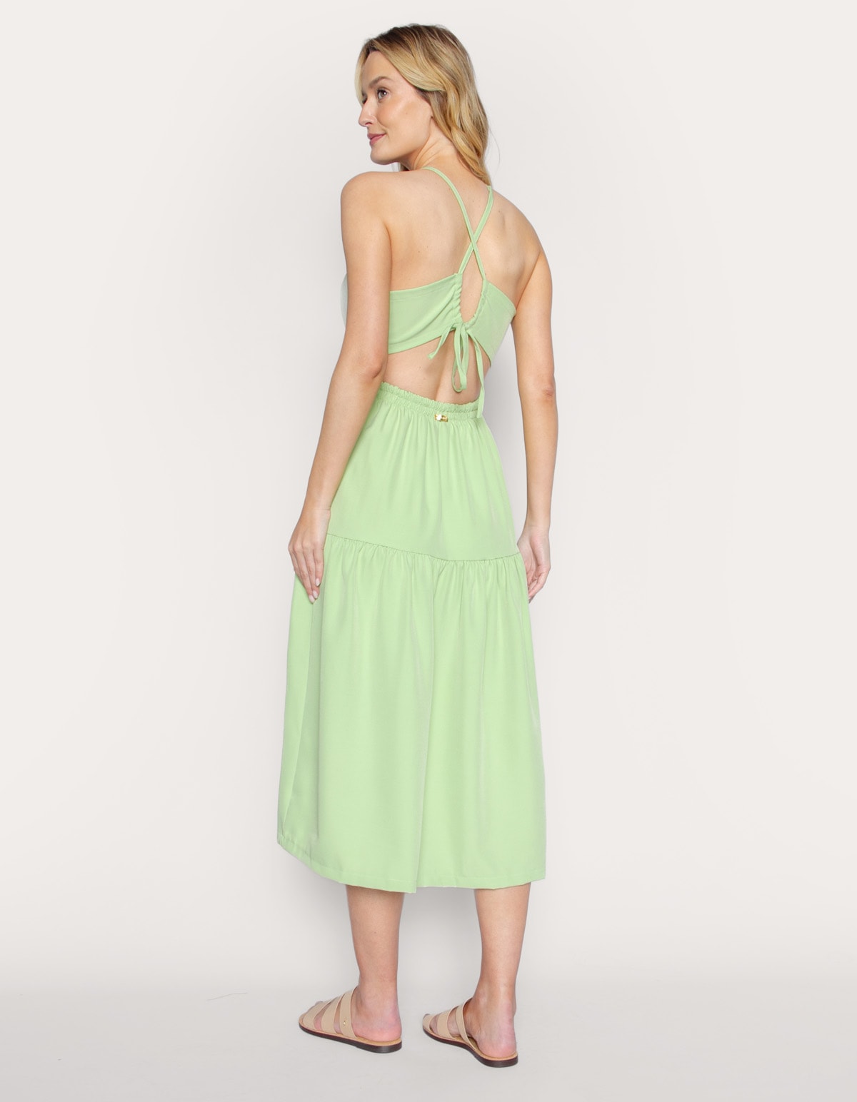 Vestido midi, frente única com bojo, amarra nas costas, possui elástico na cintura. Detalhe de recorte frontal na cintura. Este vestido é ideal para ocasiões especiais onde se deseja destacar-se com um visual refinado e moderno, perfeito para mulheres que valorizam a estética romântica em suas produções.