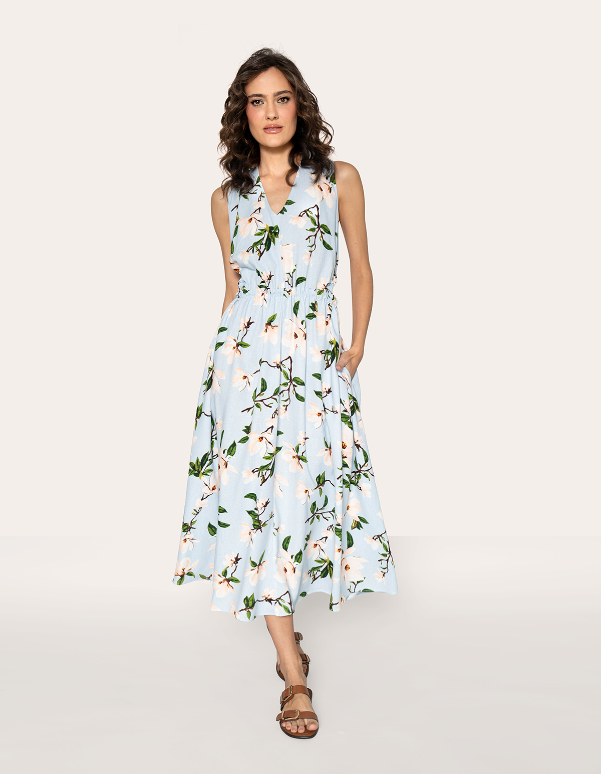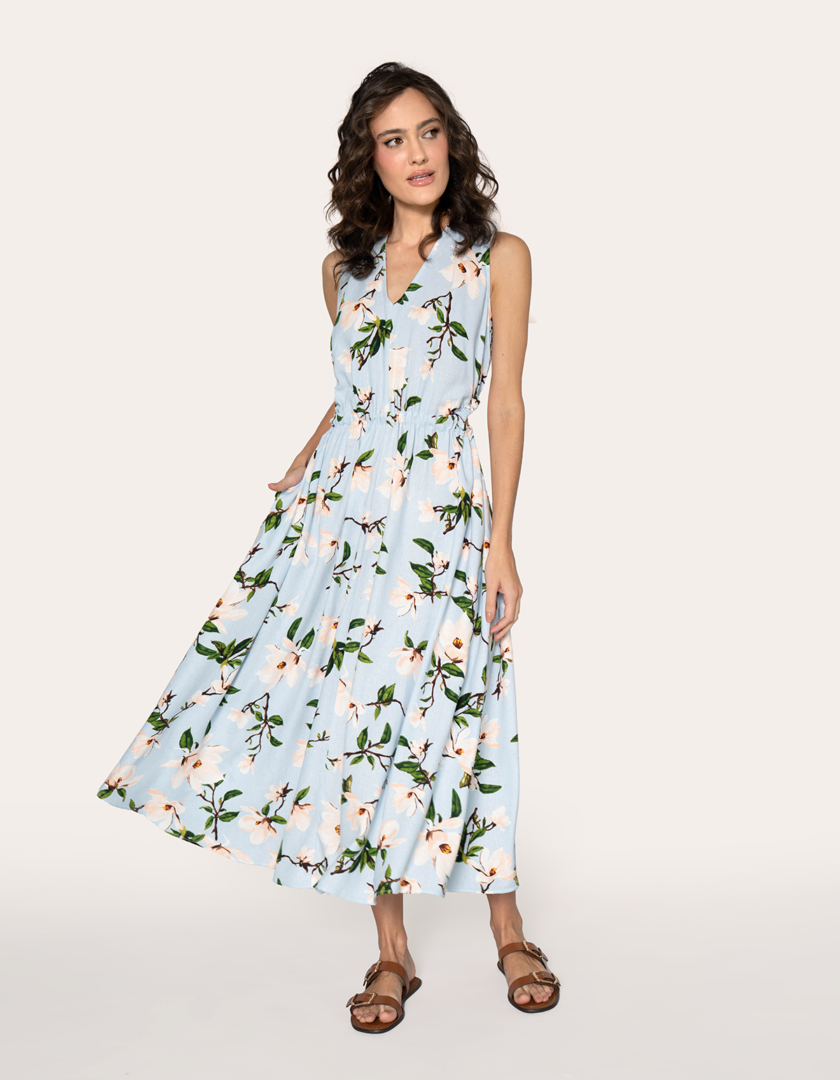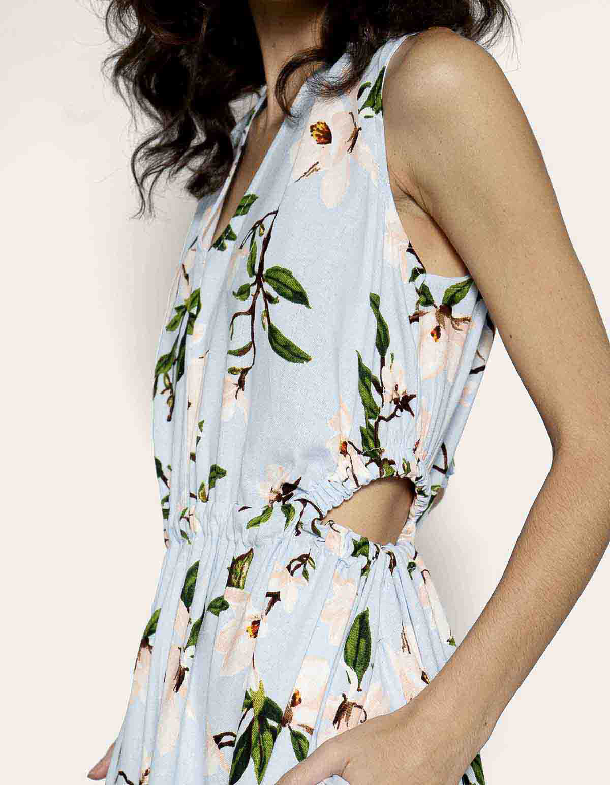 Vestido midi, possui decote v, sem mangas, com cavas ligeiramente mais fechadas, cintura marcada com elástico franzido e recortes vazados nas laterais. A saia é fluida e em formato evasê, descendo solta do franzido da cintura até a barra. As costas apresenta um design aberto e ajustável, que adiciona um toque de charme e sofisticação ao modelo casual. Os recortes laterais vazados (cut-out) são o elemento de design importante do vestido, isso confere ao vestido um toque moderno e sensual de forma discreta. Certamente esse é o vestido que transmite um ar casual e elegante ao mesmo tempo, ideal para o dia a dia, passeios ou eventos informais.