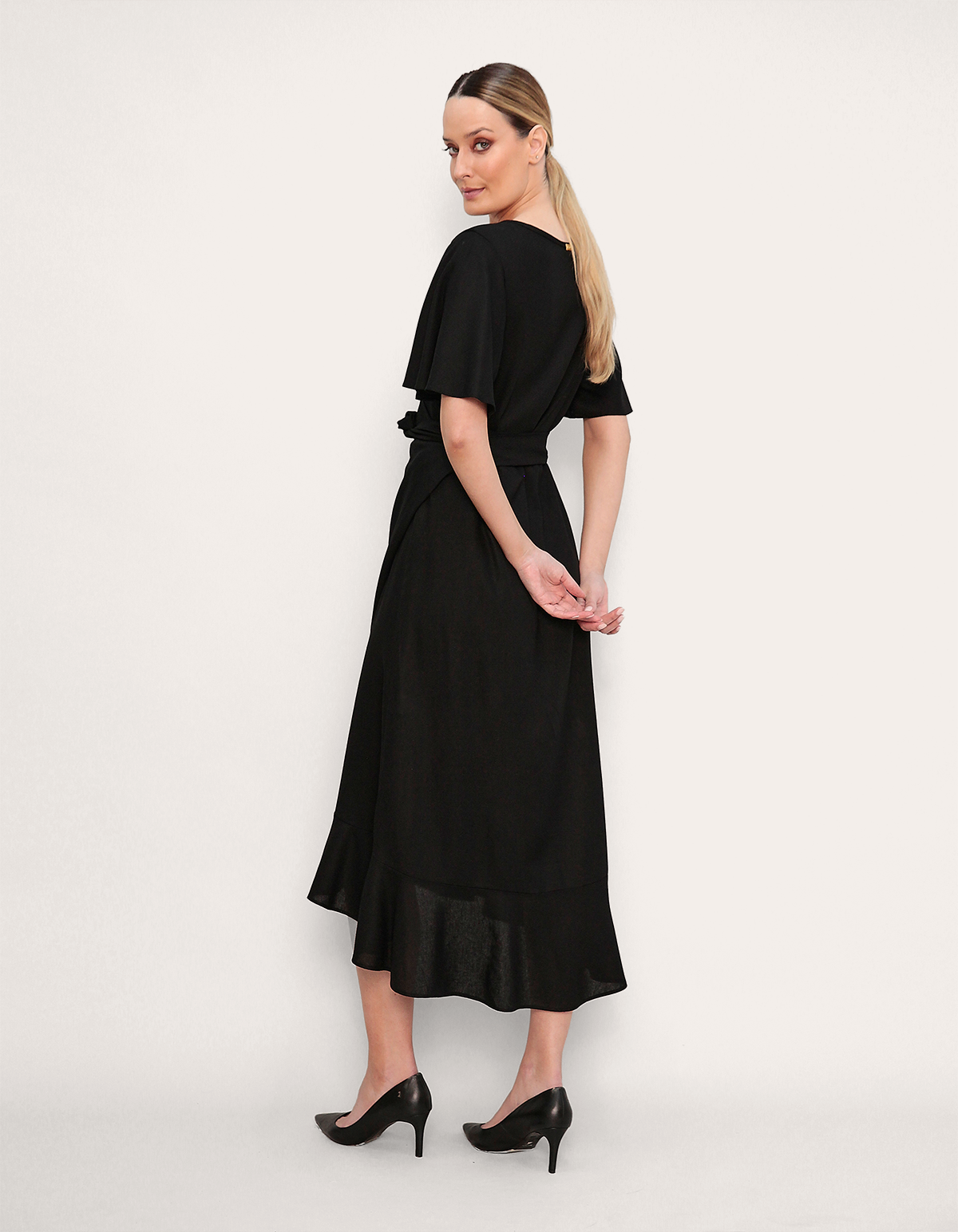 Vestido midi transpassado estilo envelope, com amarração na cintura, faixa removível e manga curta godê.