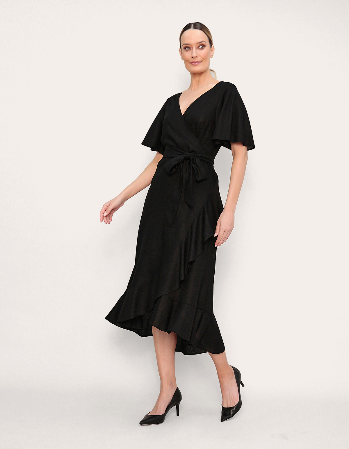 Vestido midi envelope, vestido transpassado feminino, vestido com faixa, vestido linho blend, vestido elegante casual.