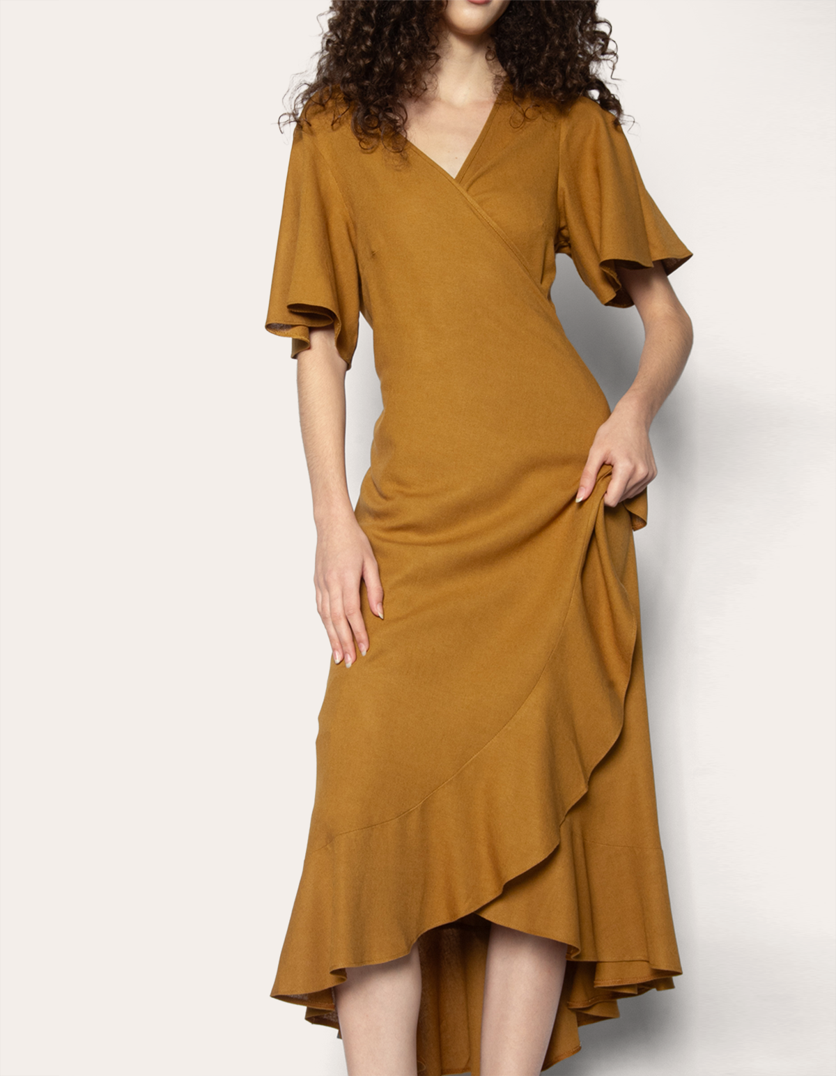 Vestido midi envelope, vestido transpassado feminino, vestido com faixa, vestido linho blend, vestido elegante casual.