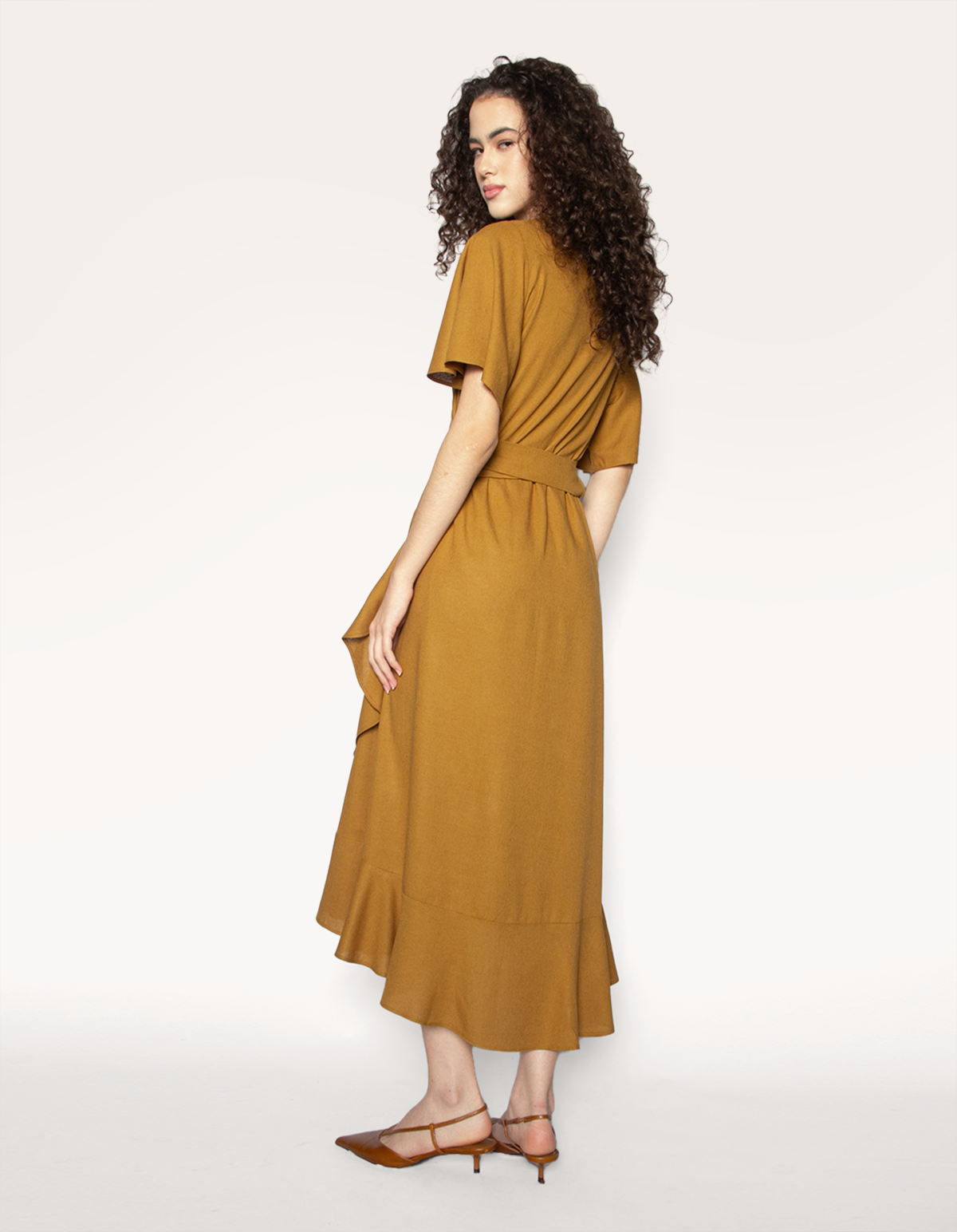 Vestido midi transpassado estilo envelope, com amarração na cintura, faixa removível e manga curta godê.