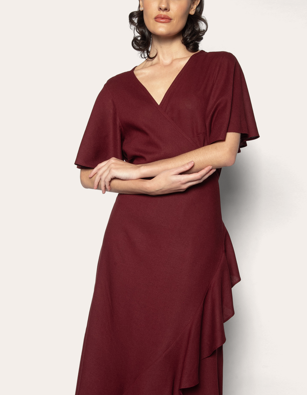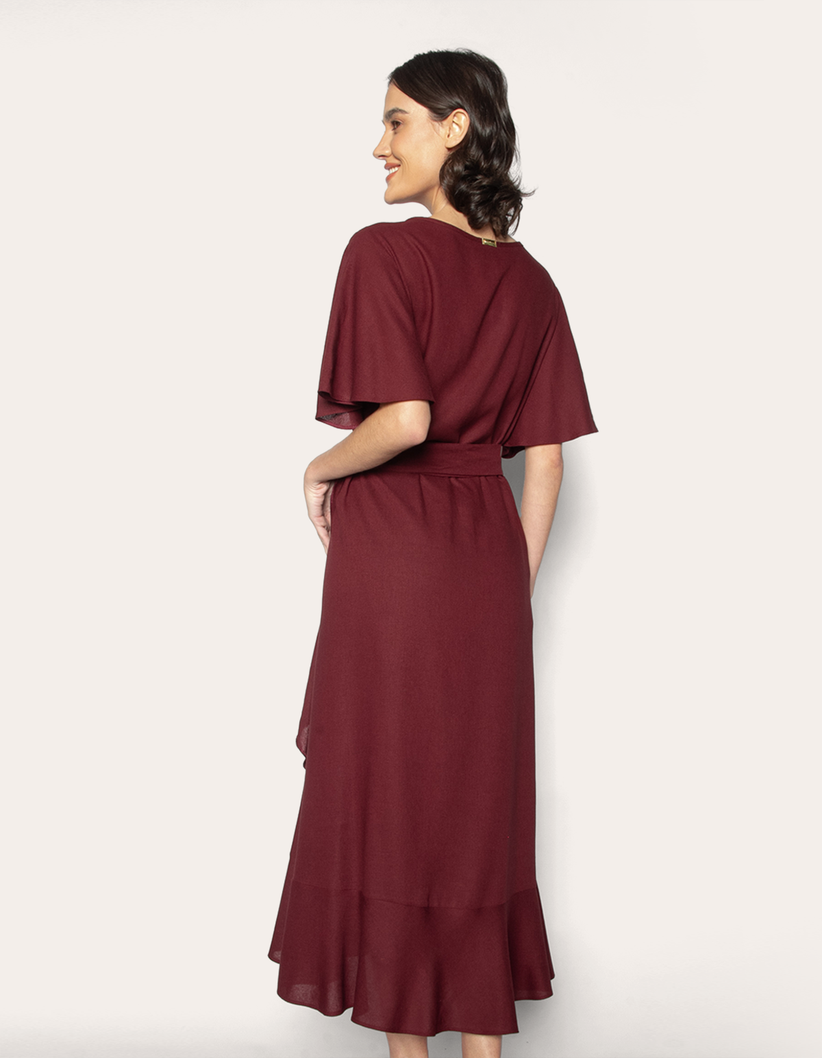 Vestido midi envelope, vestido transpassado feminino, vestido com faixa, vestido linho blend, vestido elegante casual.