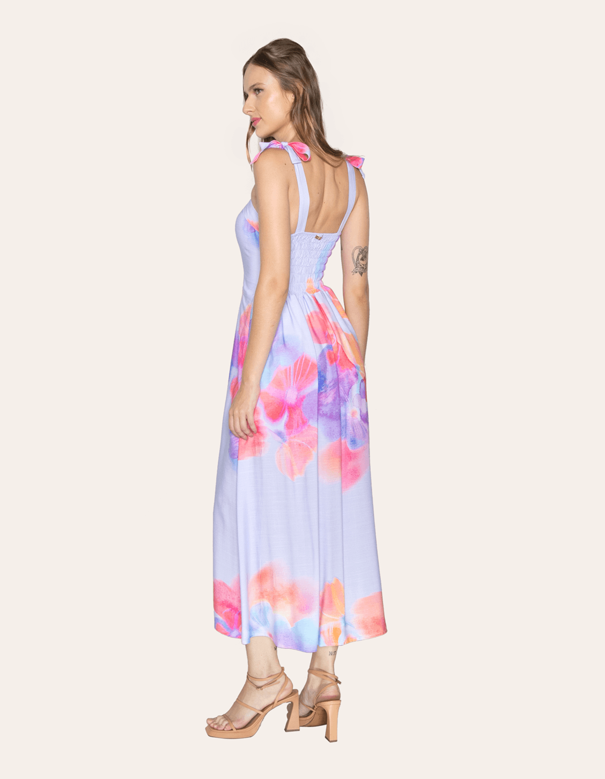 Vestido midi estampado, possui bojo, alças que amarram e lastex nas costas. modelo que tem um caimento elegante, combina com salto a até mesmo com tênis.