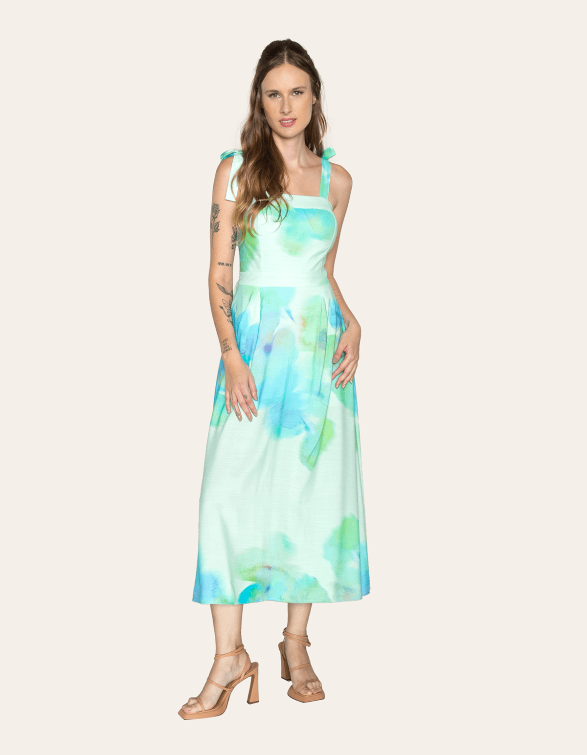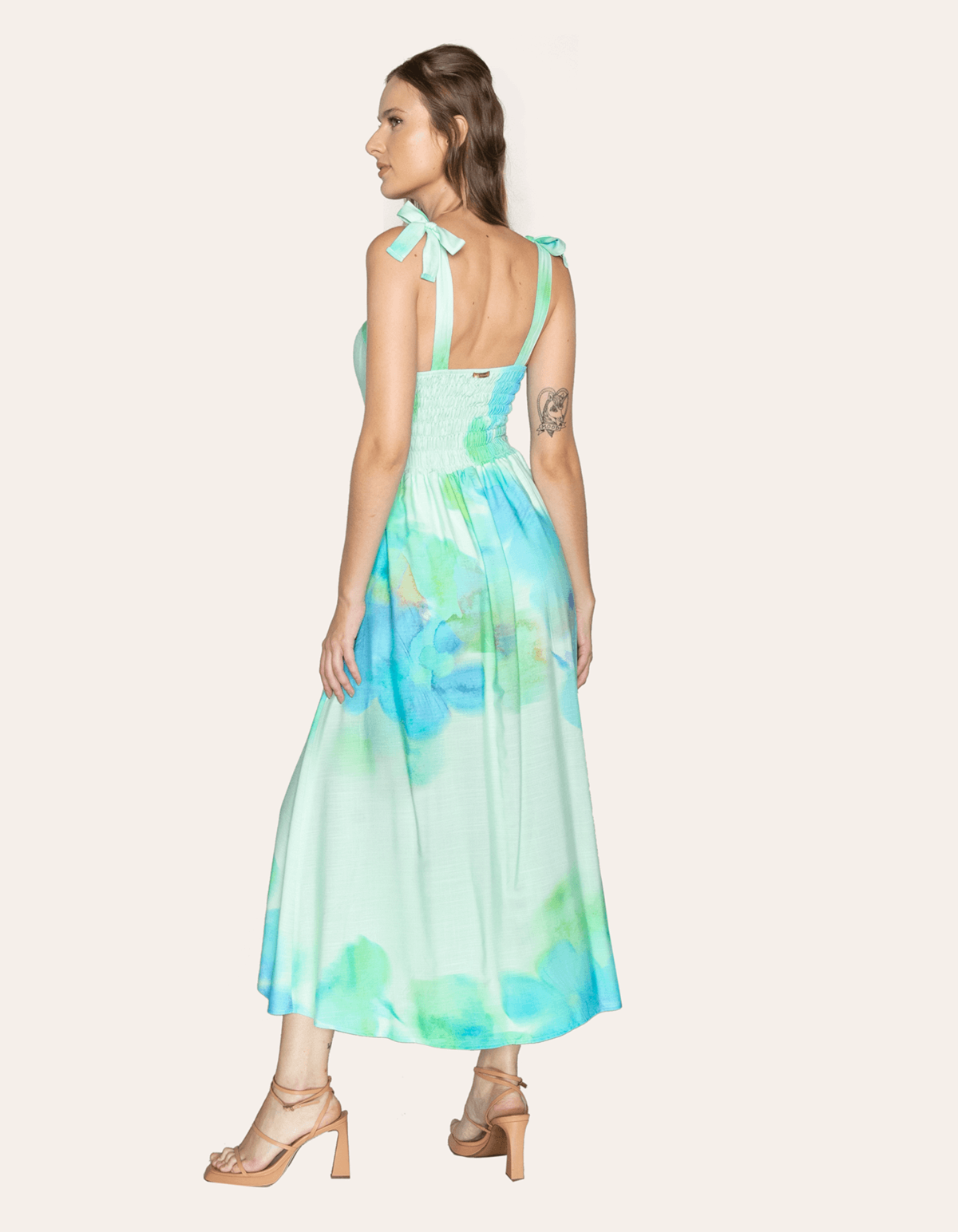 Vestido midi estampado, possui bojo, alças que amarram e lastex nas costas. modelo que tem um caimento elegante, combina com salto a até mesmo com tênis.