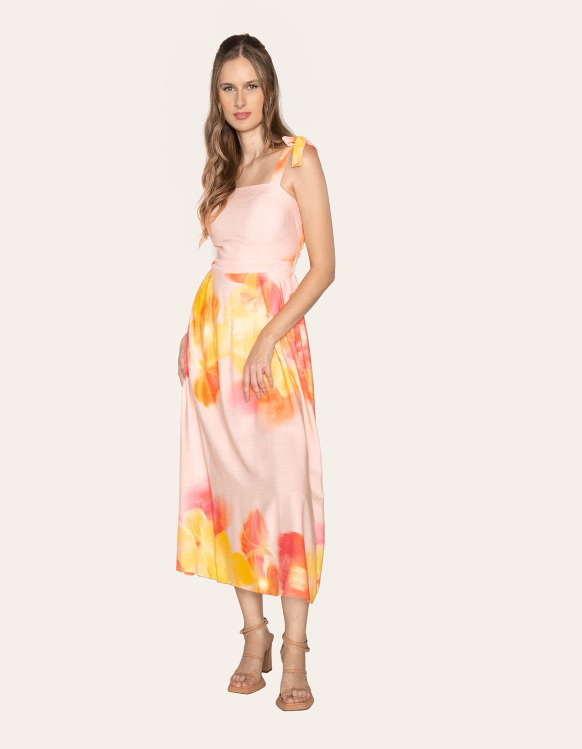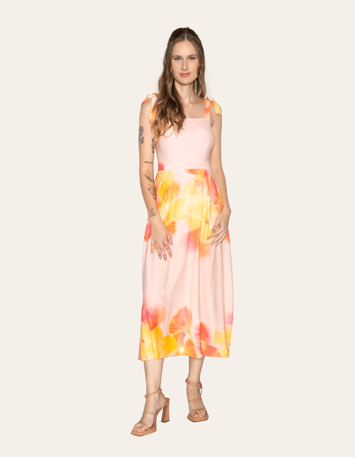Vestido midi estampado, possui bojo, alças que amarram e lastex nas costas. modelo que tem um caimento elegante, combina com salto a até mesmo com tênis.