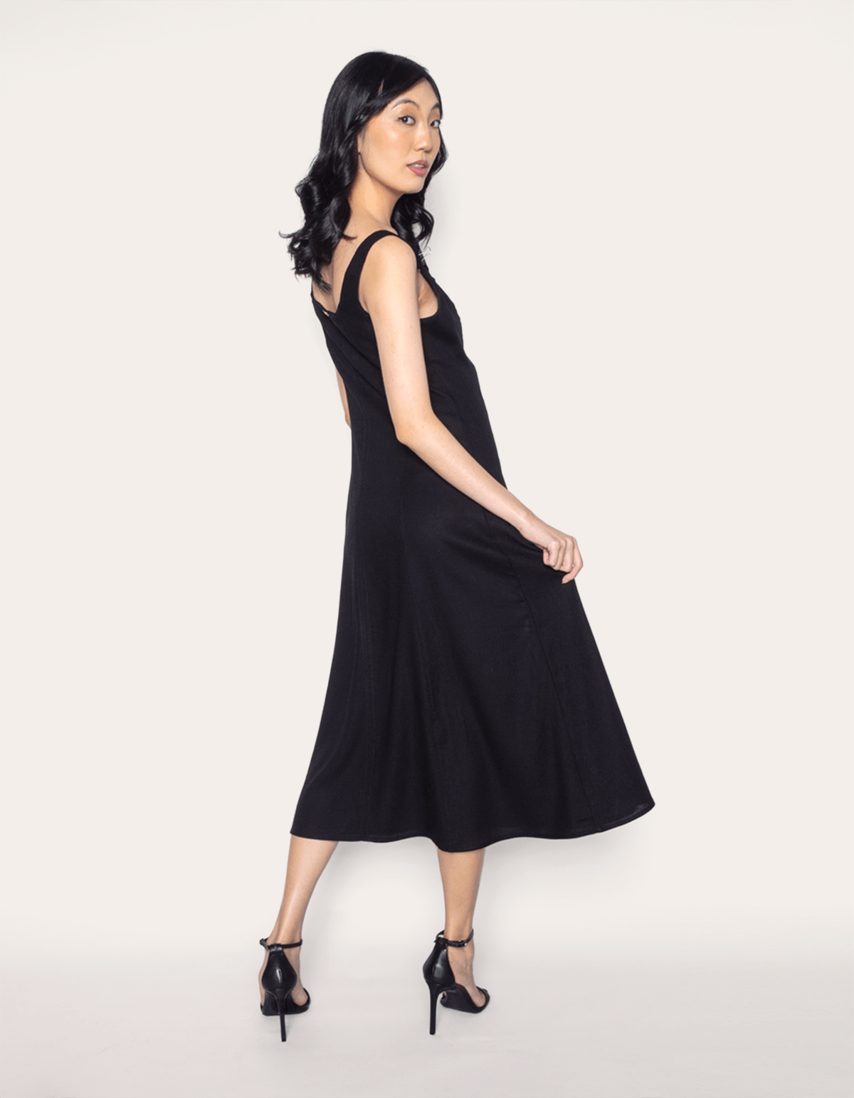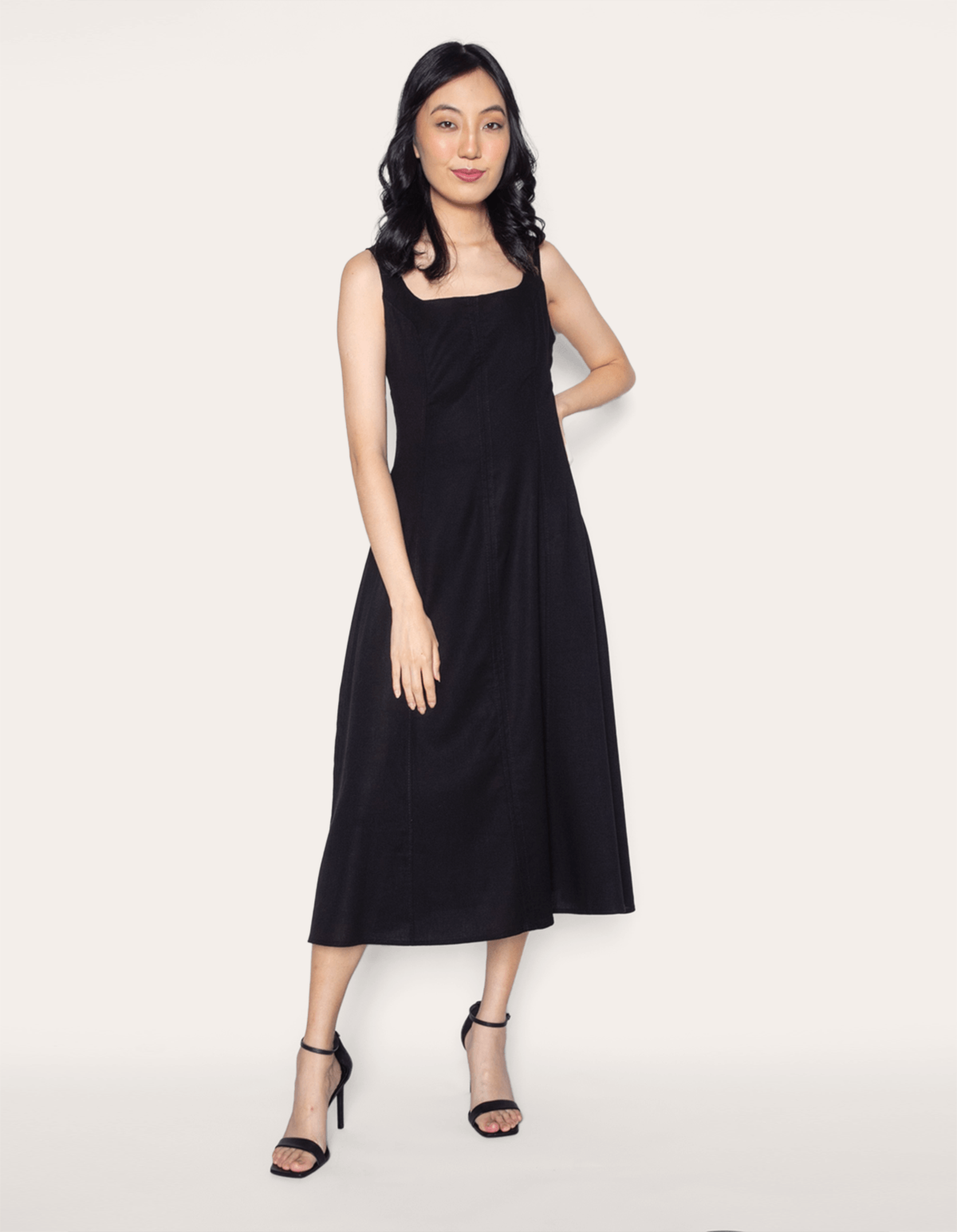 Lindíssimo vestido midi com ar retrô, possui charmoso decote quadrado e alça mais grossa. corte acinturado com saia godê trazem feminilidade e elegância ao look de verão.