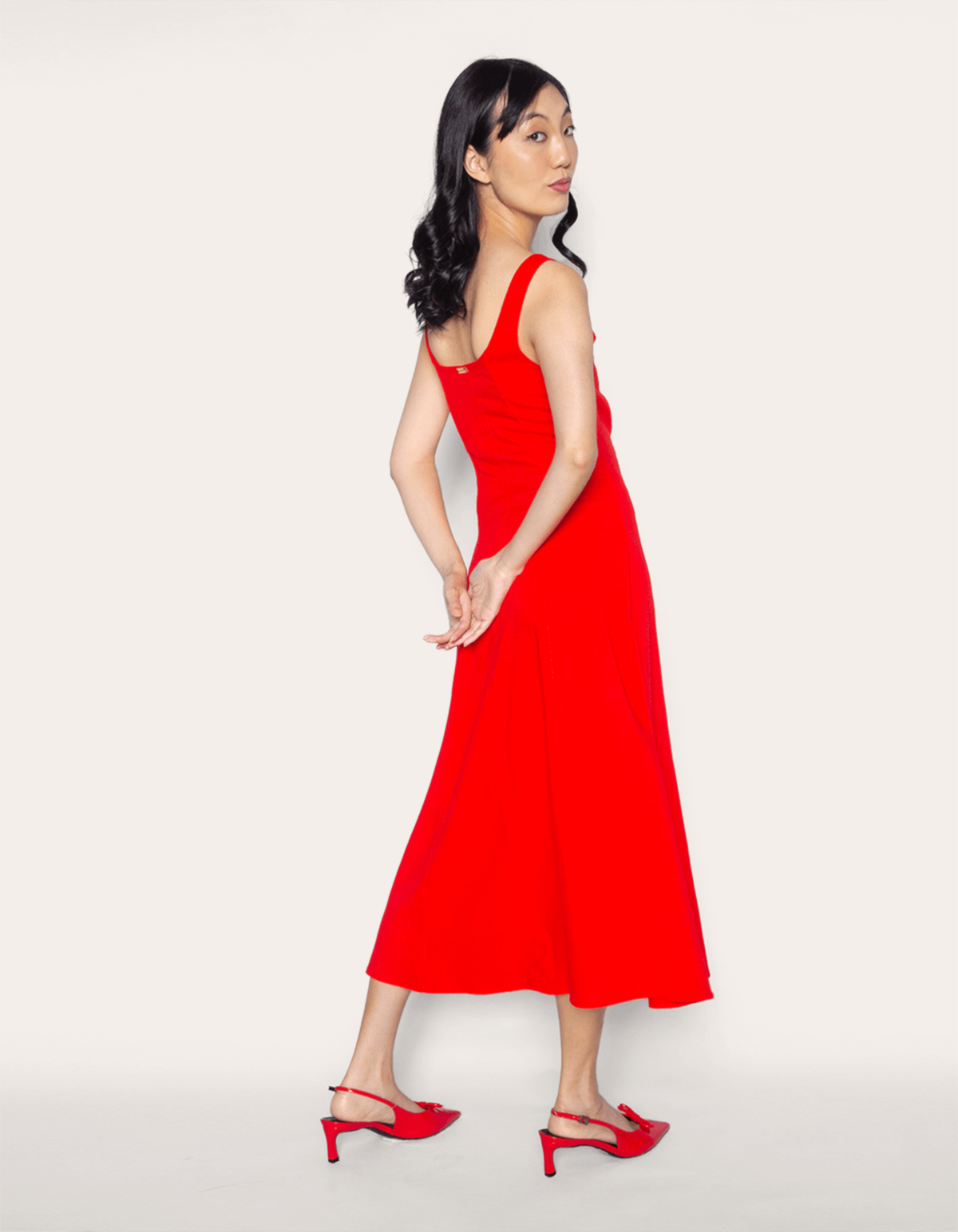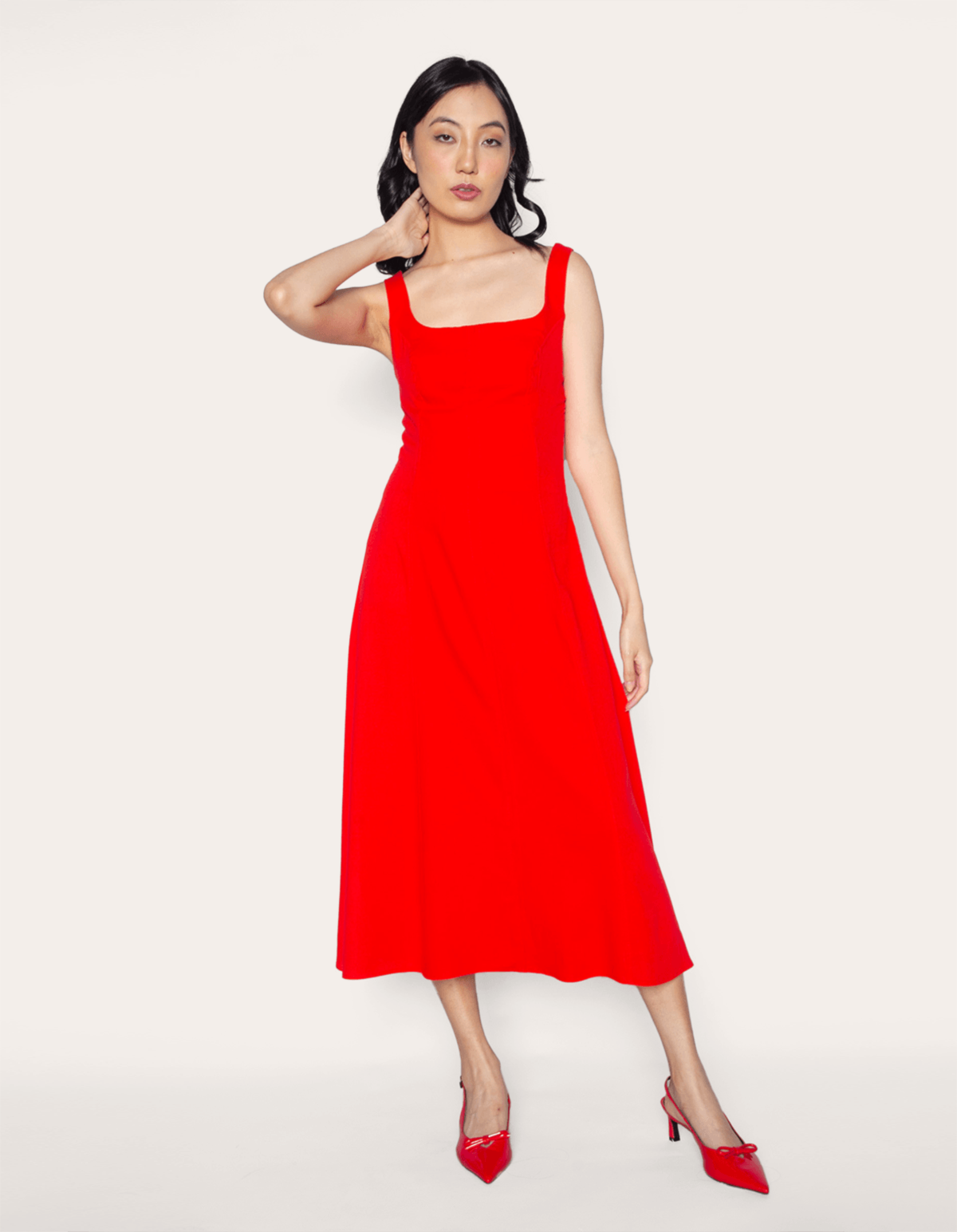 Lindíssimo vestido midi com ar retrô, possui charmoso decote quadrado e alça mais grossa. corte acinturado com saia godê trazem feminilidade e elegância ao look de verão.