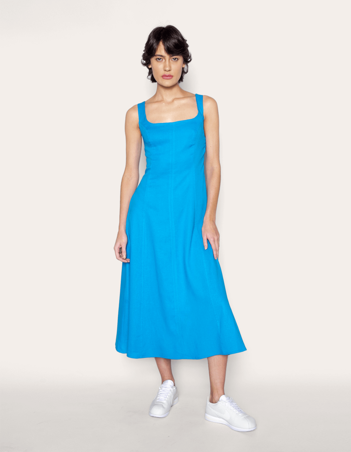Lindíssimo vestido midi com ar retrô, possui charmoso decote quadrado e alça mais grossa. corte acinturado com saia godê trazem feminilidade e elegância ao look de verão.