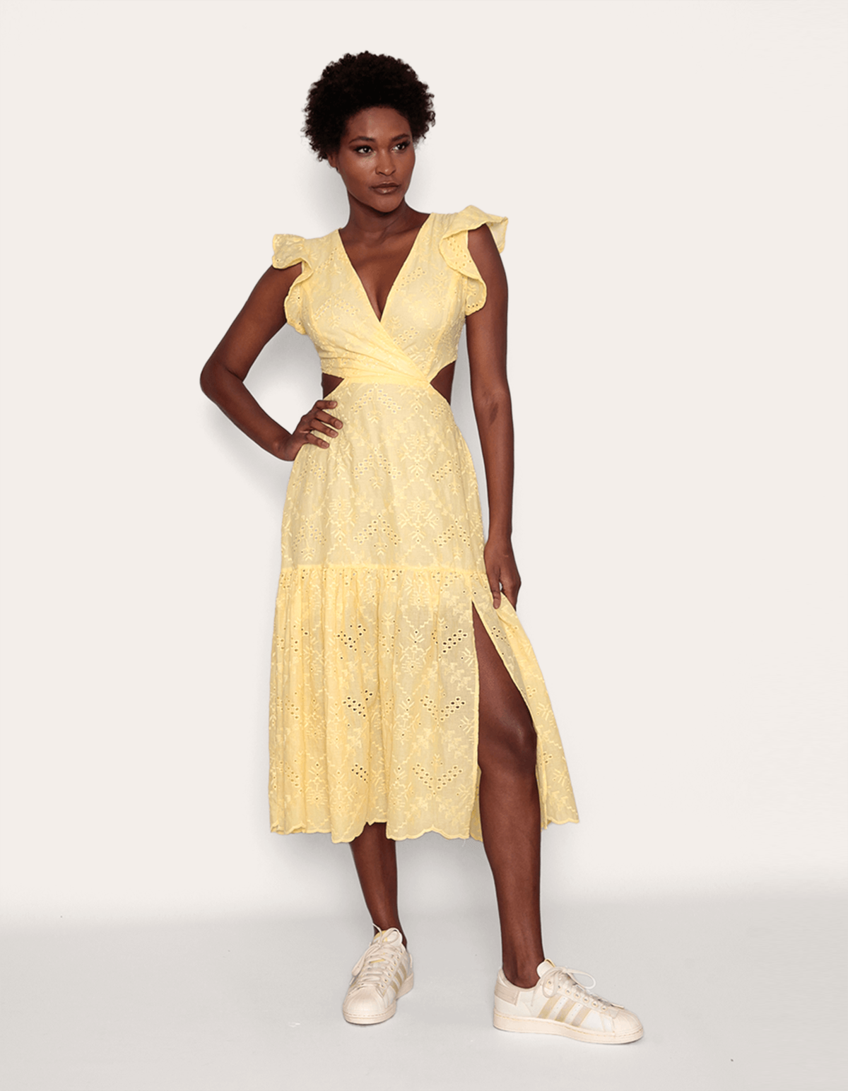 Vestido midi laise, decote transpassado, cava com babado, recortes na lateral e amarra atrás, possui elástico atrás na cintura e forro. uma peça perfeita para qualquer ocasião! feminino e poderoso, esse vestido valoriza e desenha o corpo. aposte nele que nessa estação!