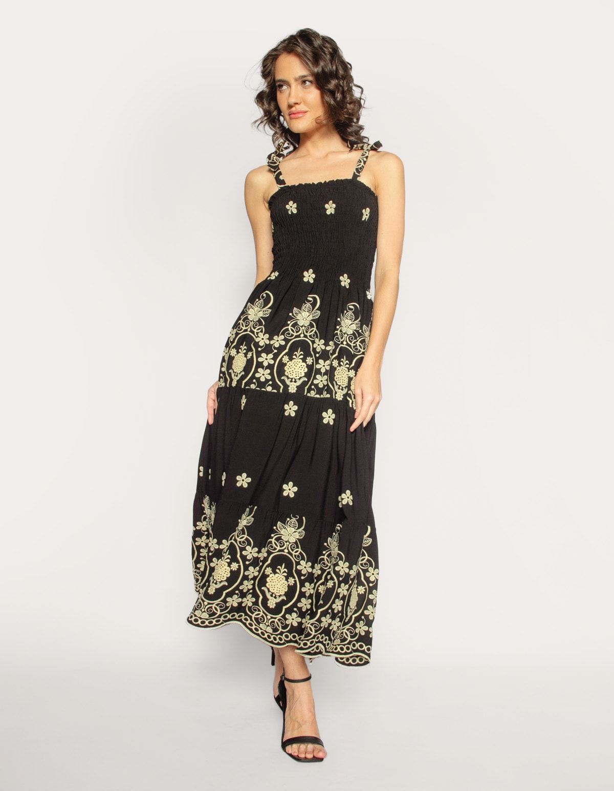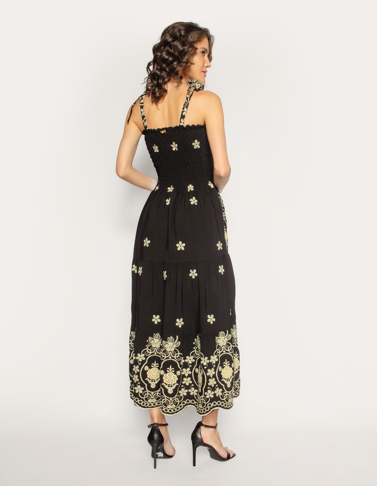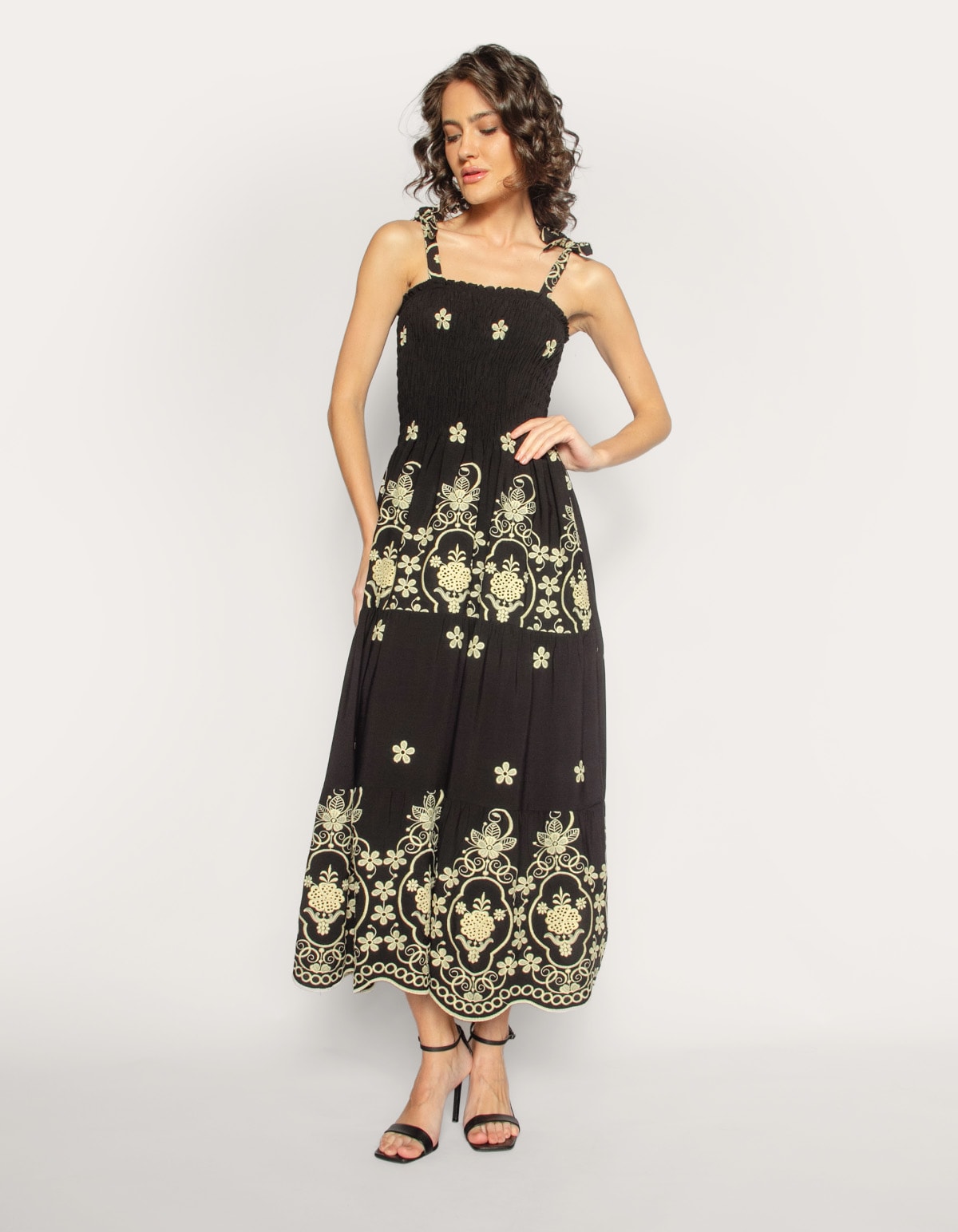 Vestido midi bordado, decote reto estilo camponês, a parte do corpete é feito com a técnica smock (lastex), o que proporciona um ajuste elástico e modelador ao corpo. As alças são de amarrar nos ombros, permitindo que quem usa ajuste o comprimento, o laço nas alças adiciona um toque decoratio, a cintura é marcada pela transição do smock apertado do busto ara a saia mais solta, dando uma silhueta império ou cintura alta.