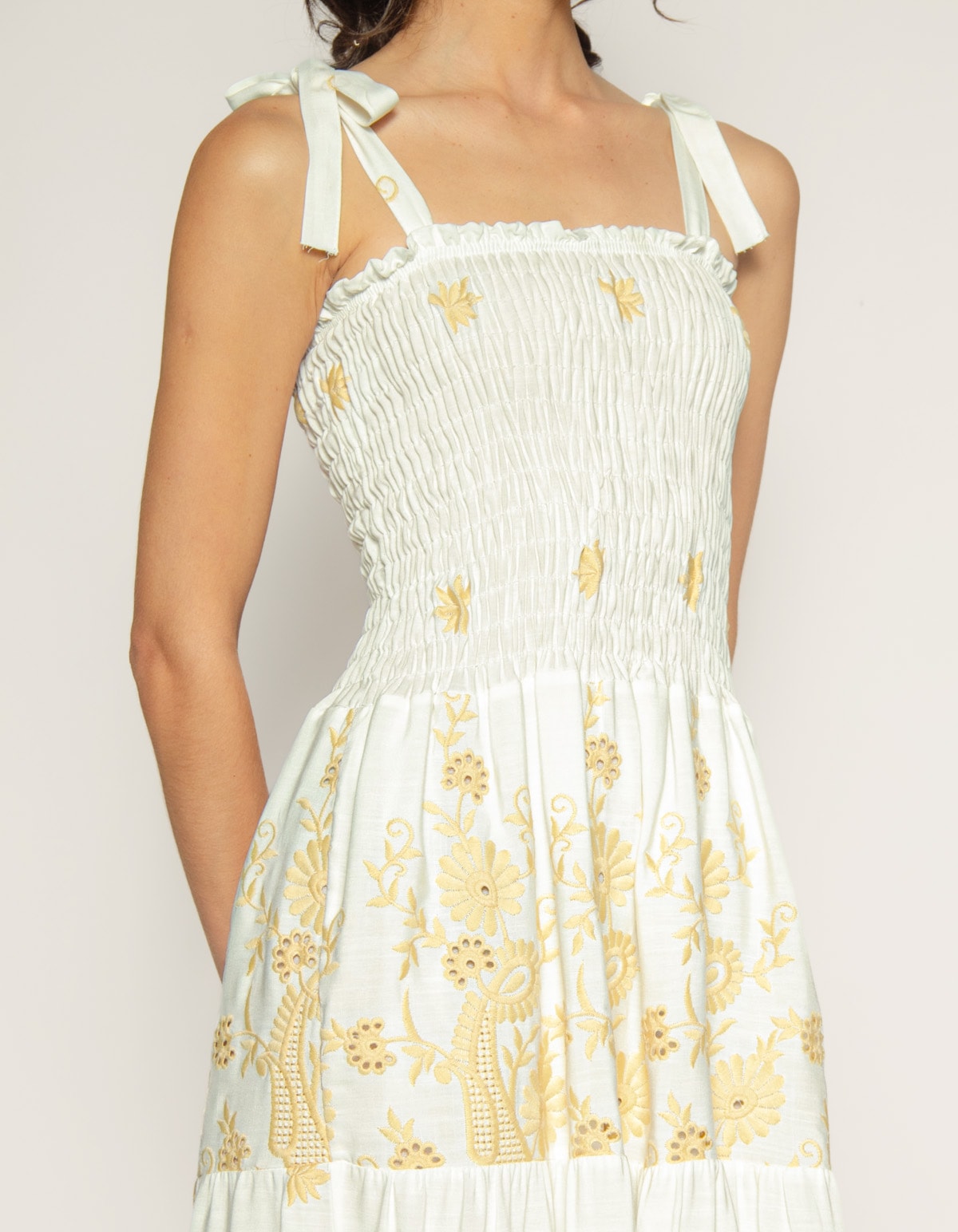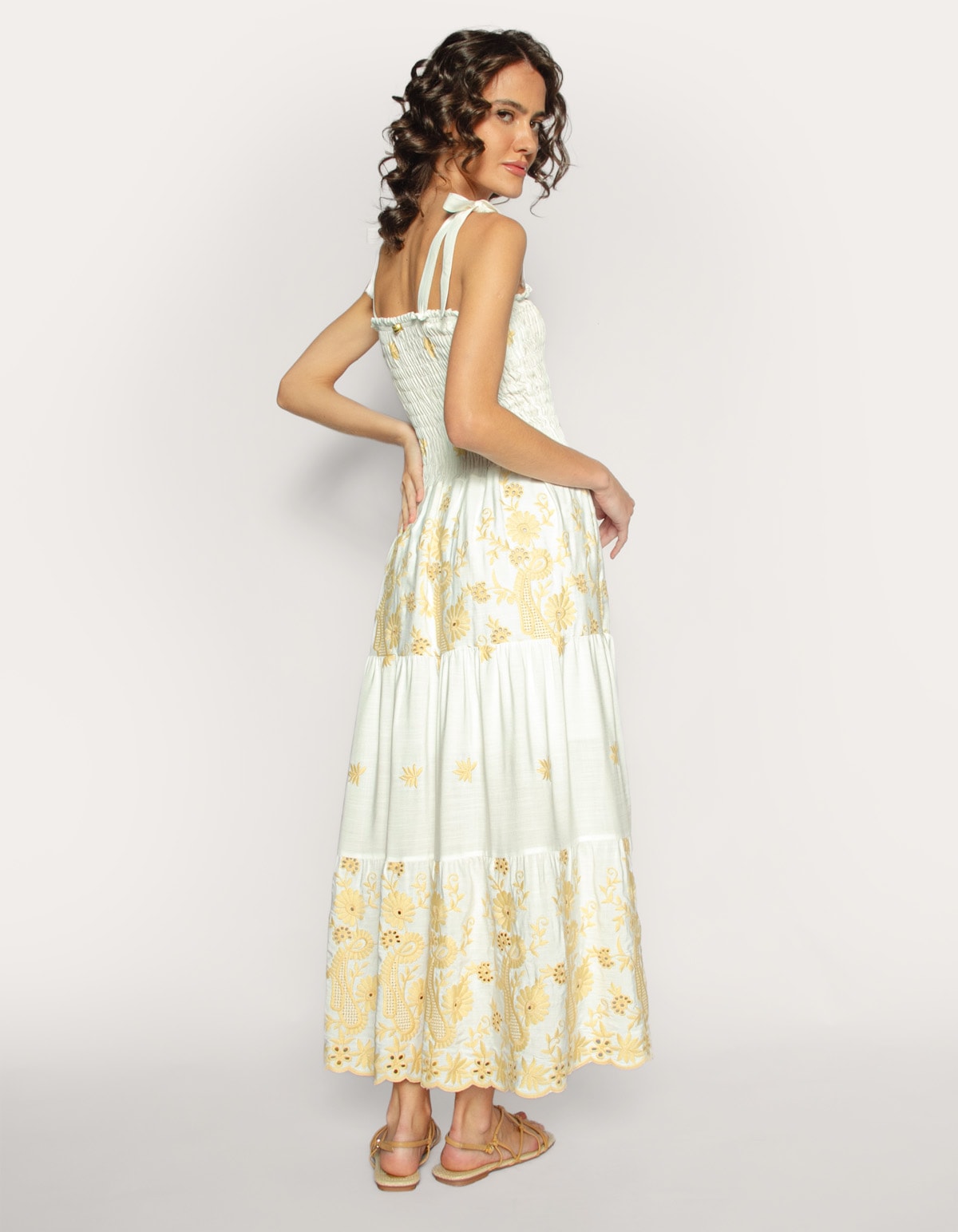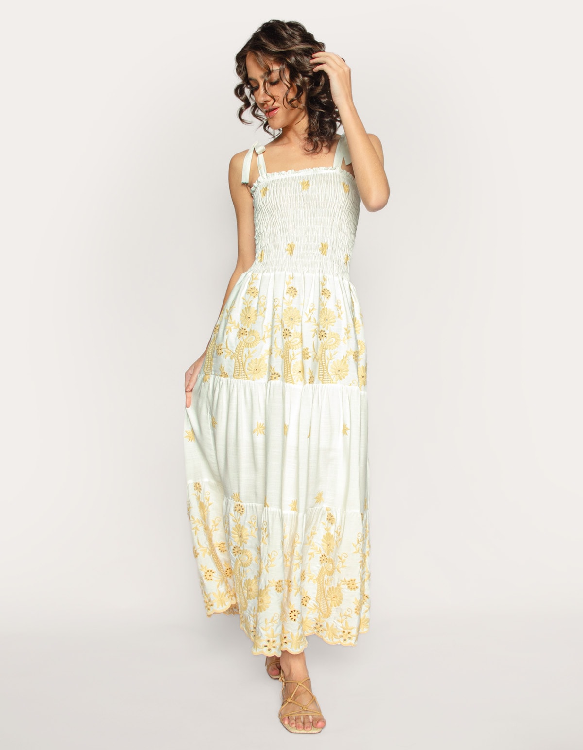 Vestido midi bordado, decote reto estilo camponês, a parte do corpete é feito com a técnica smock (lastex), o que proporciona um ajuste elástico e modelador ao corpo. As alças são de amarrar nos ombros, permitindo que quem usa ajuste o comprimento, o laço nas alças adiciona um toque decoratio, a cintura é marcada pela transição do smock apertado do busto ara a saia mais solta, dando uma silhueta império ou cintura alta.