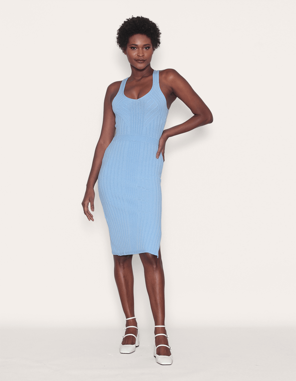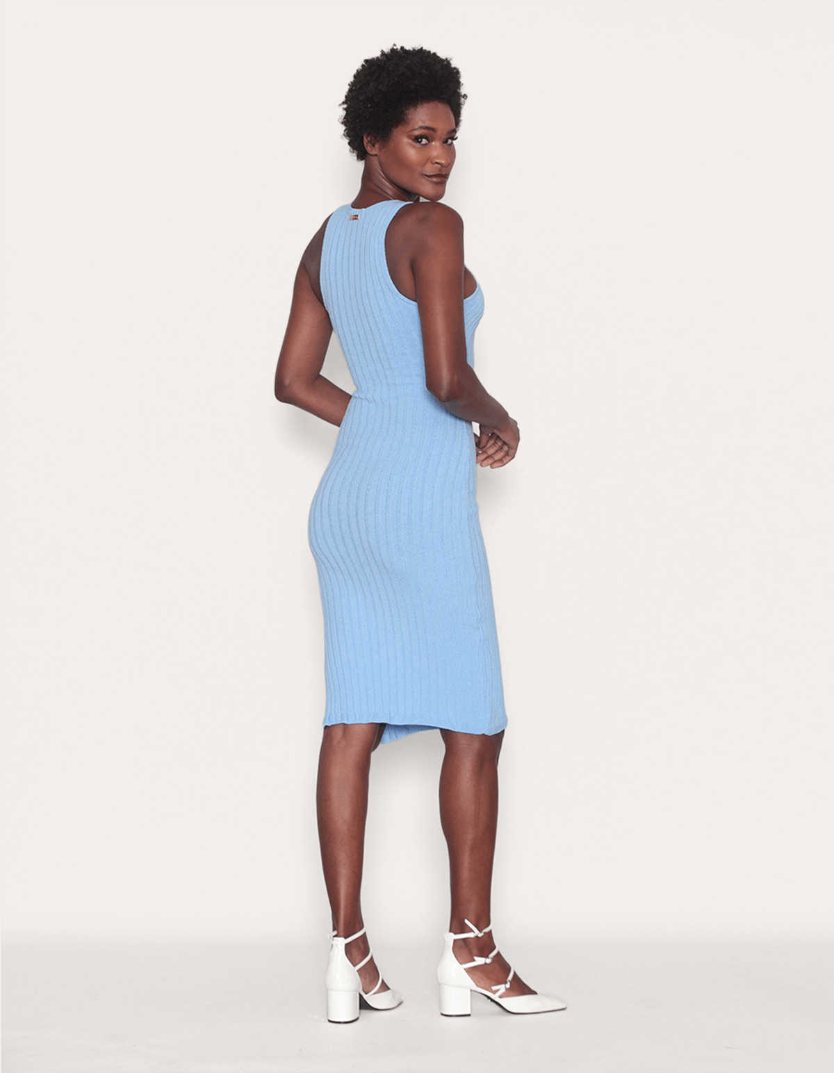 Vestido midi tricot canelado, decote v, cavado. possui fenda lateral. modelo super versátil, pode ser usado com salto, tênis e rasteirinha, formando diversos looks!