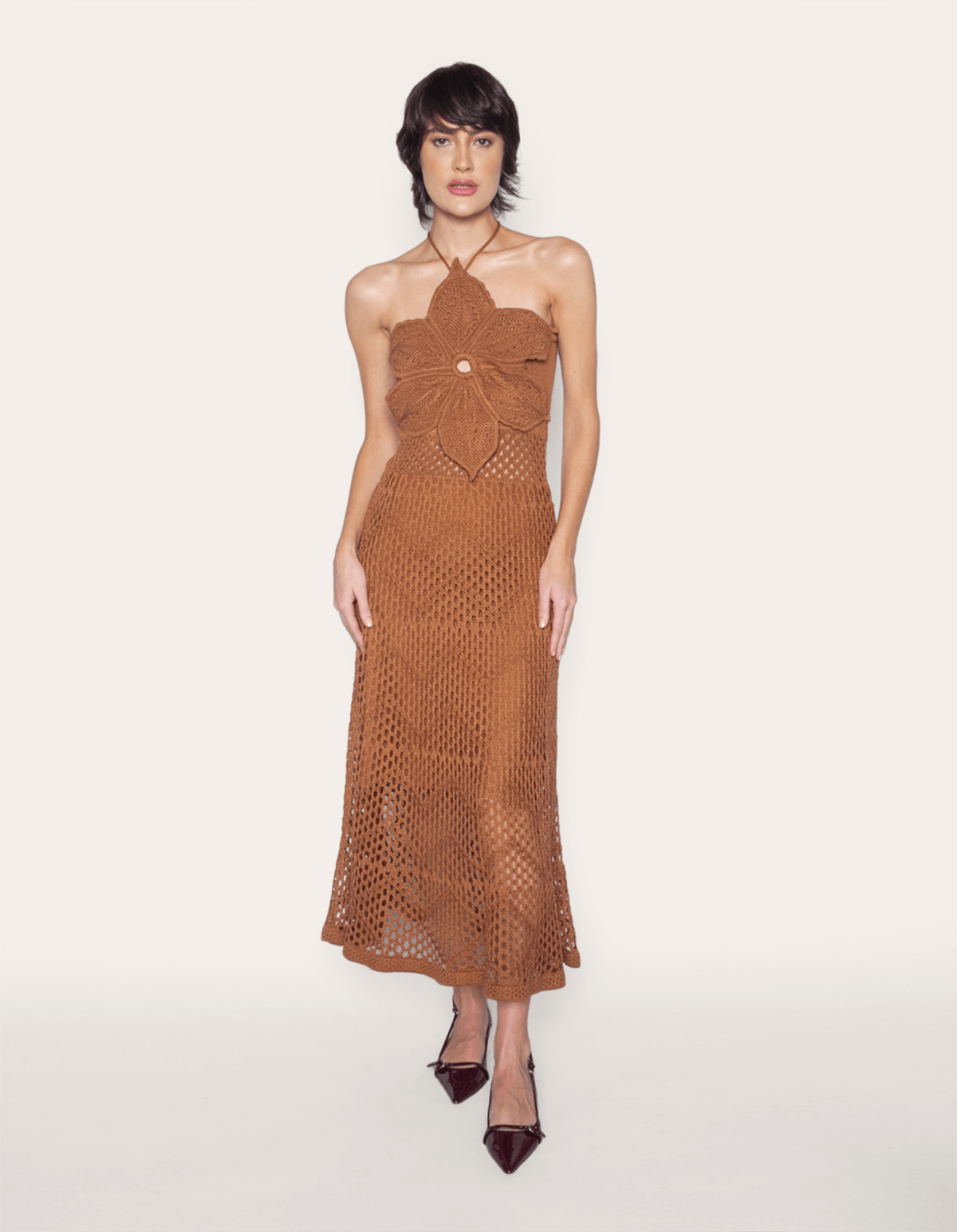 Vestido midi com amarração no pescoço e flor de aplicação, veste muito bem. possui forro. uma peça que combina elegância e conforto. com um design rendado e detalhes florais, este vestido é perfeito para diversas ocasiões, desde um passeio até eventos mais sofisticados.