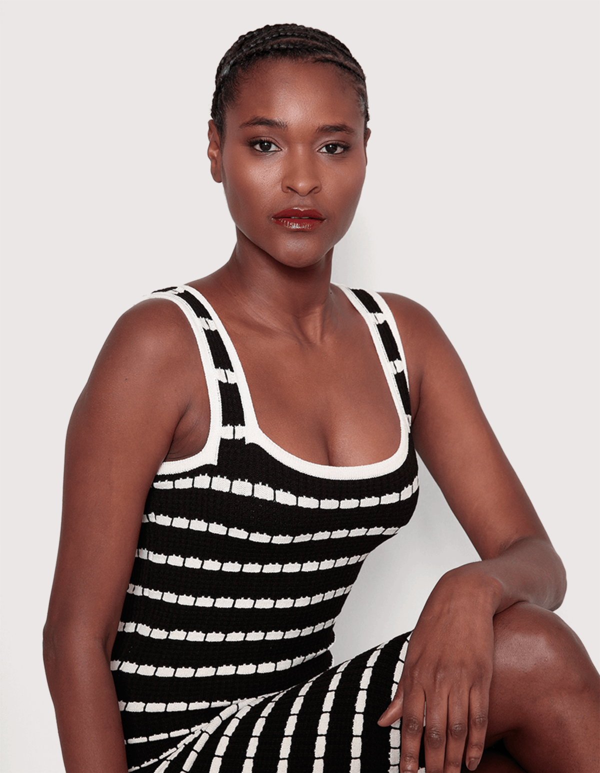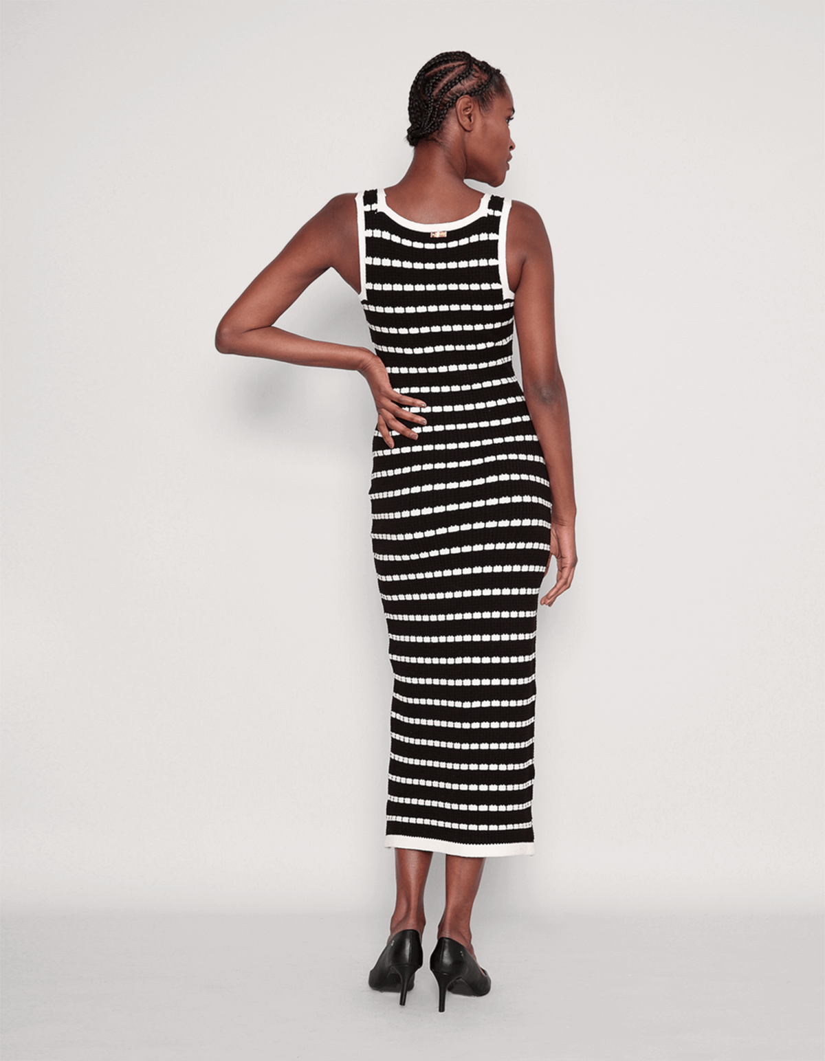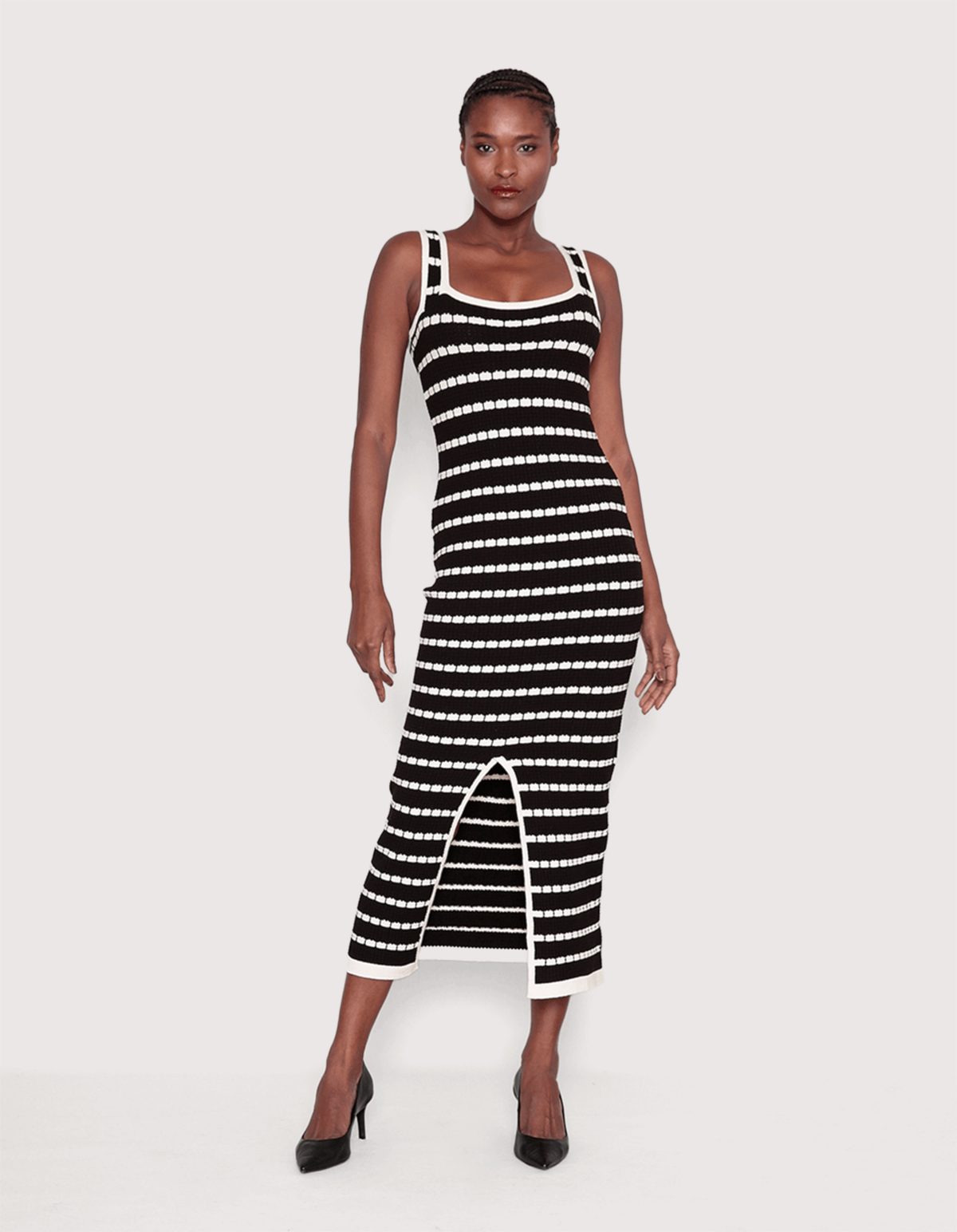 Vestido midi tricot listrado, alça média e com fenda na frente. além de lindo é super confortável! a escolha perfeita para criar um look básico incrível.