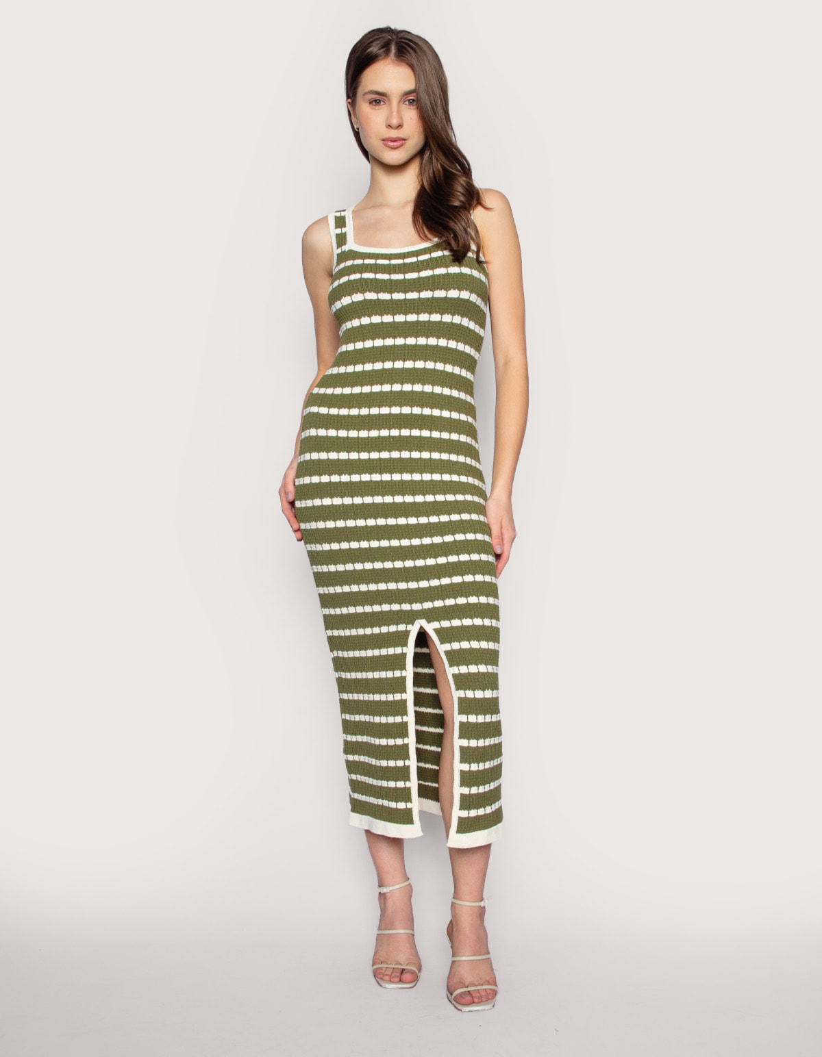 Vestido midi tricot listrado, alça média e com fenda na frente. além de lindo é super confortável! a escolha perfeita para criar um look básico incrível.