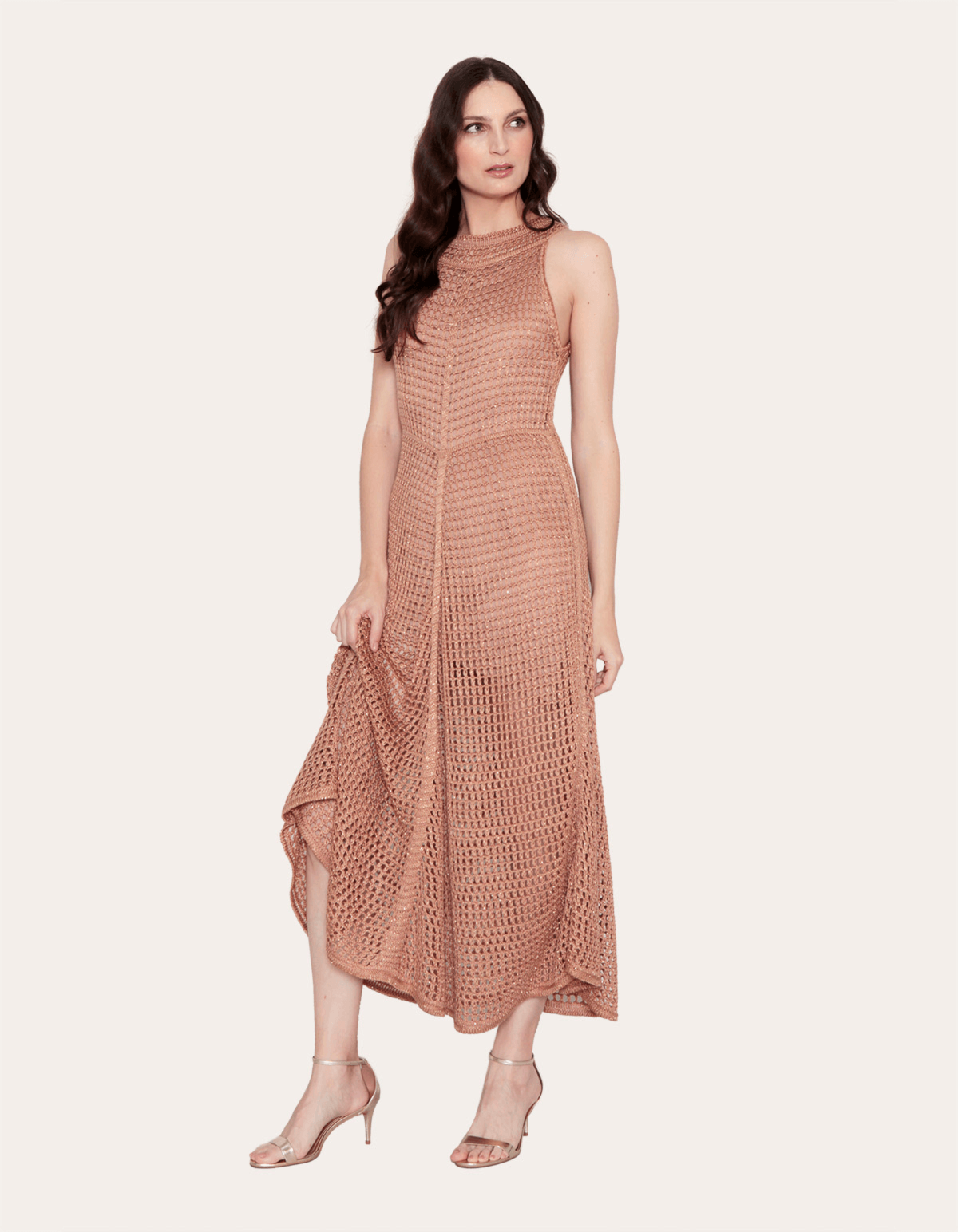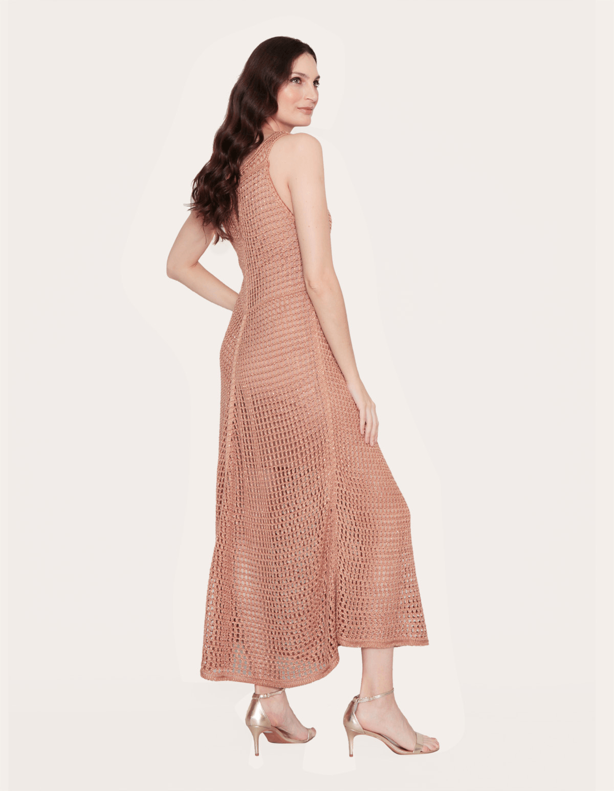 Vestido midi tricot lurex rendado, detalhe costas em gota e fechamento na gola por botões de pedra. deseja aquele look prático, moderno e confortável para te acompanhar nas ocasiões especiais? a escolha perfeita é ele!