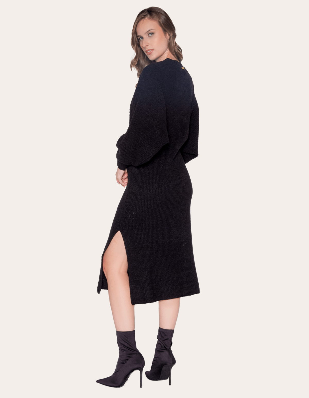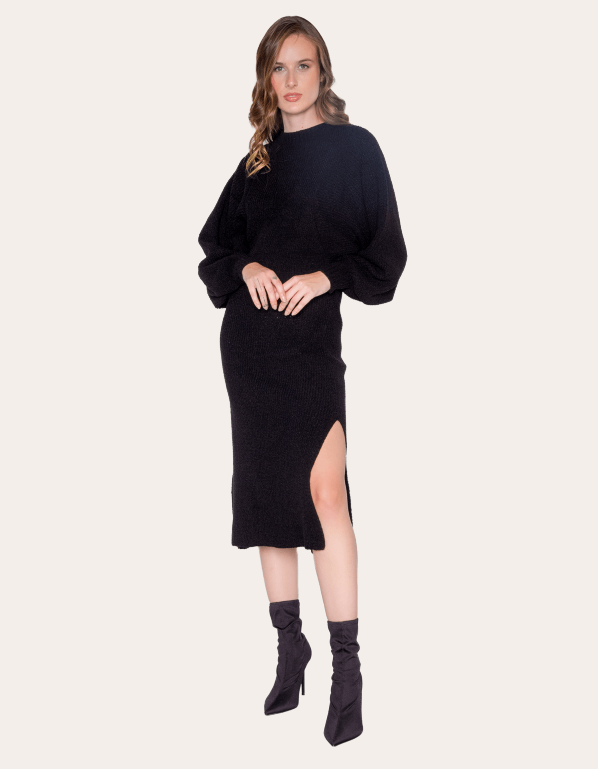 Vestido tricot manga longa bufante, comprimento midi com fendas nas laterais. é a escolha perfeita para ocasiões especiais.